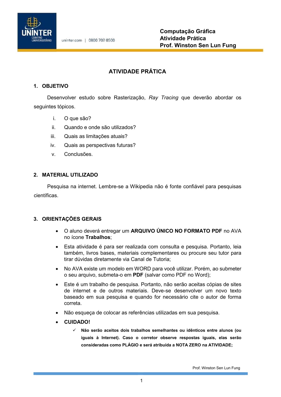 O aluno deverá entregar um ARQUIVO ÚNICO NO FORMATO PDF no AVA no ícone Trabalhos;