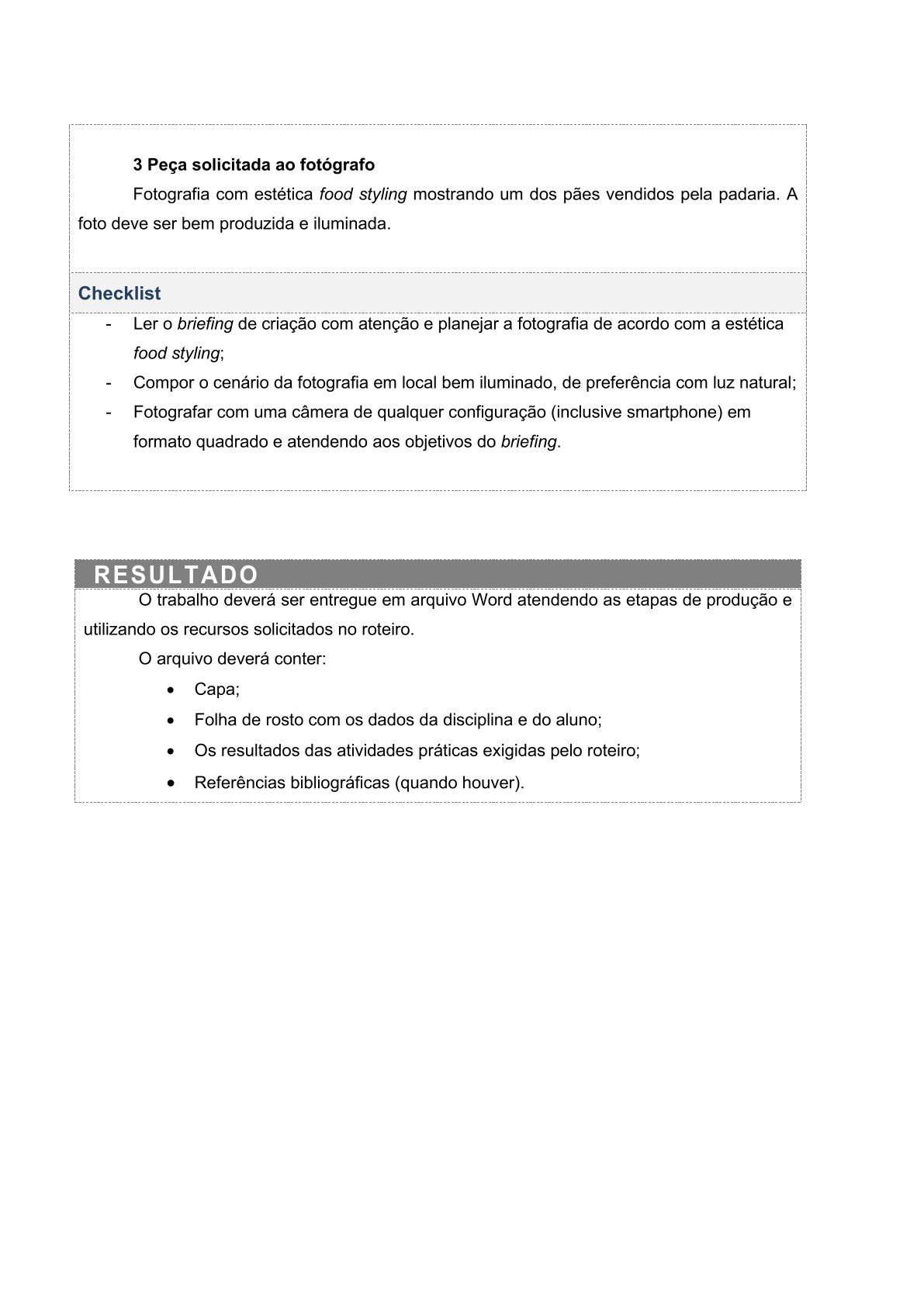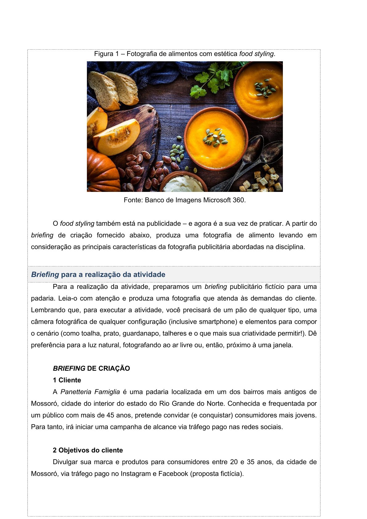 Para a realização da atividade, preparamos um briefing publicitário fictício para uma padaria. Leia-o com atenção e produza uma fotografia que atenda às demandas do cliente.