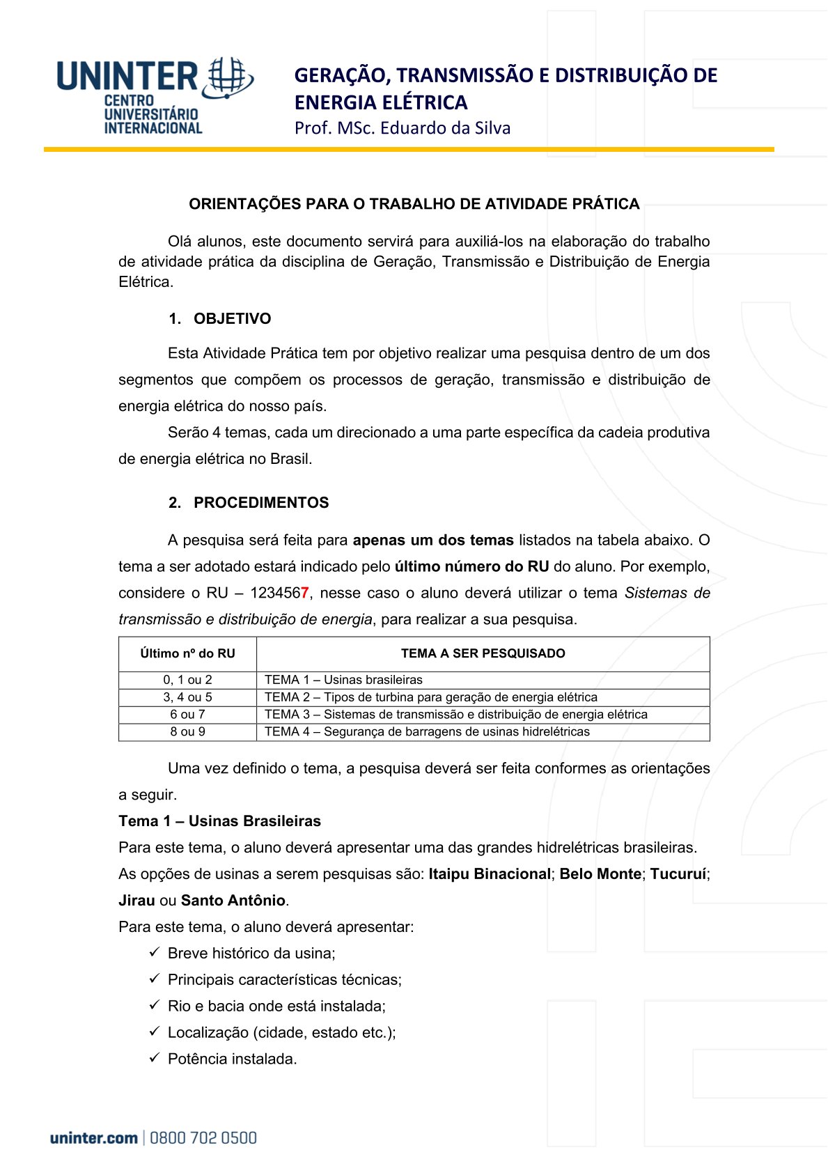 ATIVIDADE PRÁTICA – GERAÇÃO, TRANSMISSÃO, DISTRIBUIÇÃO E USOS FINAIS DE ENERGIA ELÉTRICA – TEMA 2