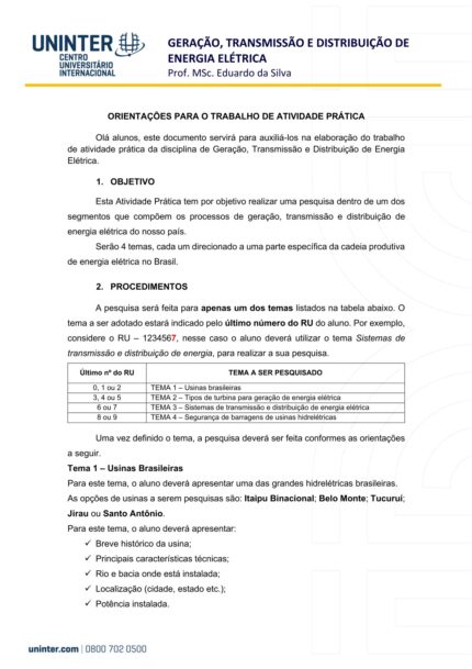 Esta Atividade Prática tem como objetivo realizar uma pesquisa dentro de um dos segmentos que compõem os processos de geração, transmissão e distribuição de energia elétrica no Brasil.
