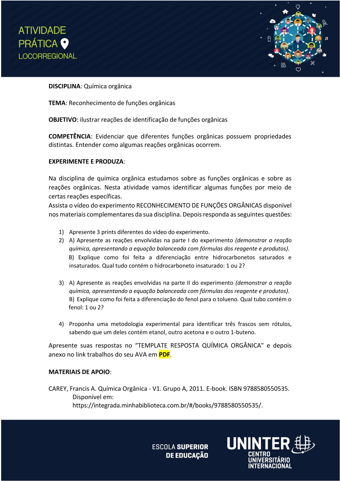 ATIVIDADE PRÁTICA LOCORREGIONAL – QUÍMICA ORGÂNICA – RECONHECIMENTO DE FUNÇÕES ORGÂNICAS