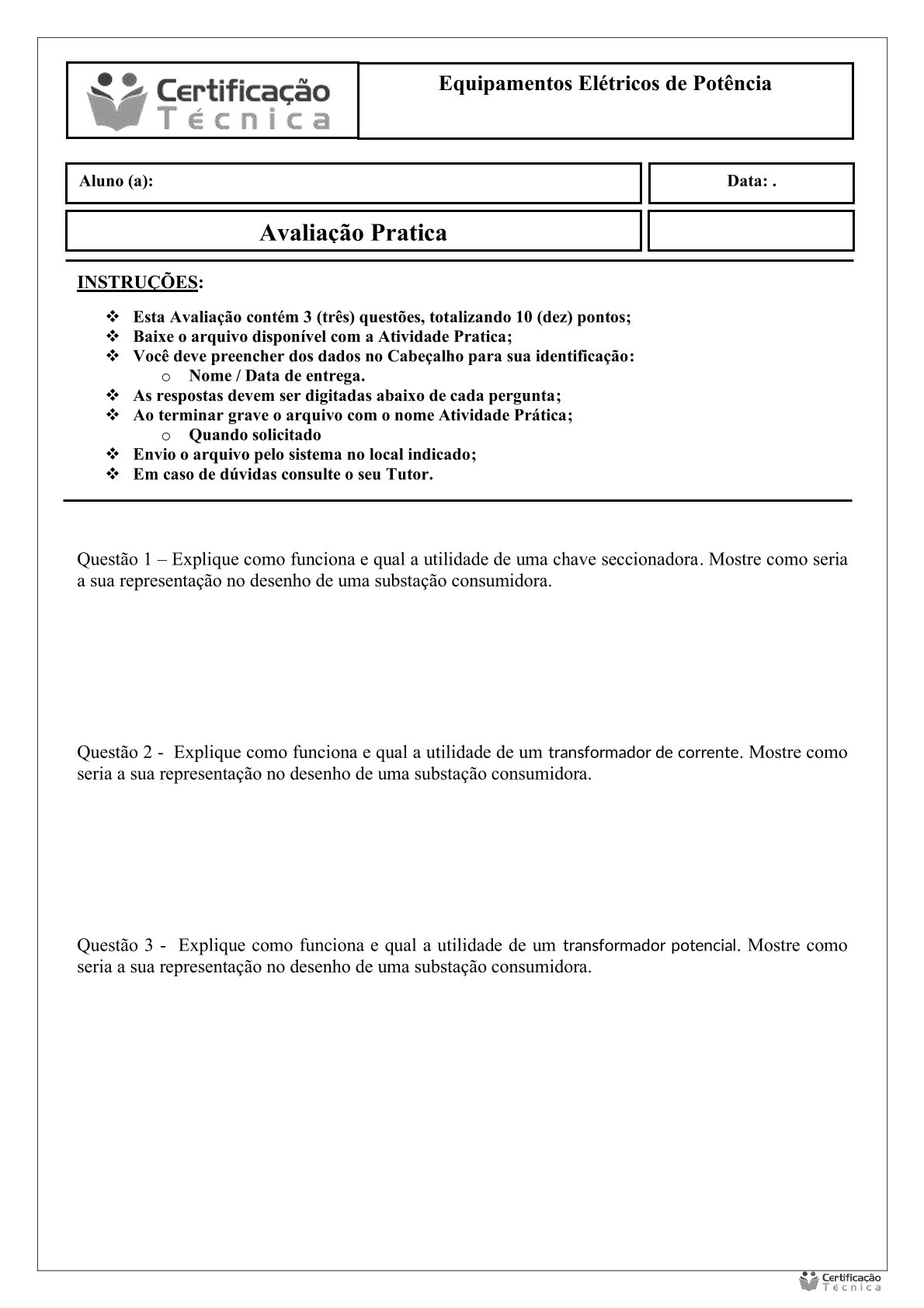 CERTIFICAÇÃO TÉCNICA – AVALIAÇÃO PRÁTICA – EQUIPAMENTOS ELÉTRICOS DE POTÊNCIA