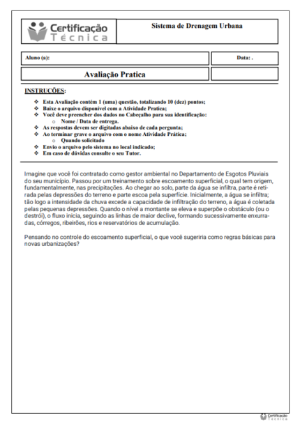 AVALIAÇÃO PRÁTICA – SISTEMA DE DRENAGEM URBANA – CERTIFICAÇÃO TÉCNICA