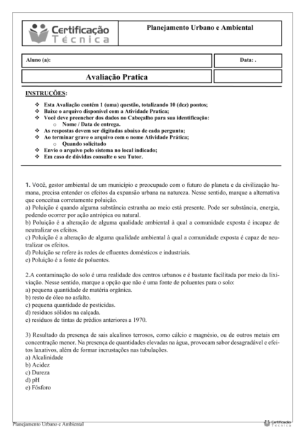 AVALIAÇÃO PRÁTICA – PLANEJAMENTO URBANO E AMBIENTAL – CERTIFICAÇÃO TÉCNICA
