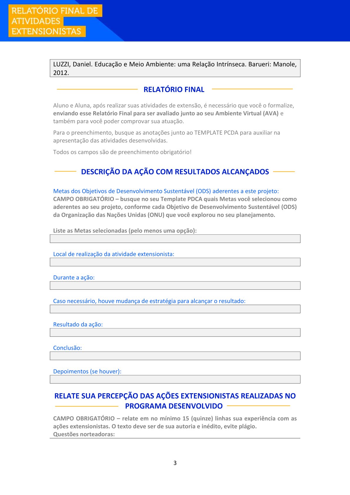 Após a realização das atividades de extensão, o aluno deverá formalizar sua participação enviando este Relatório Final para avaliação no Ambiente Virtual de Aprendizagem (AVA), a fim de comprovar sua atuação.