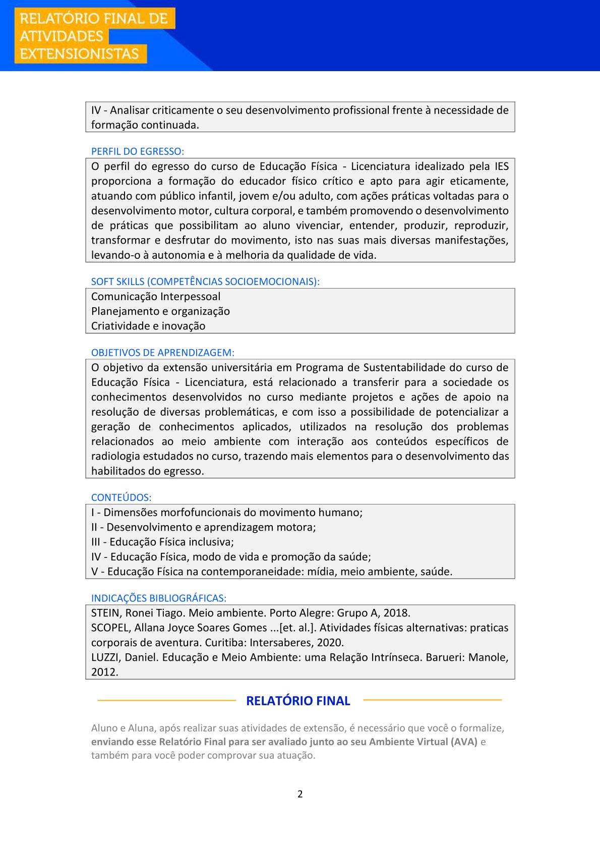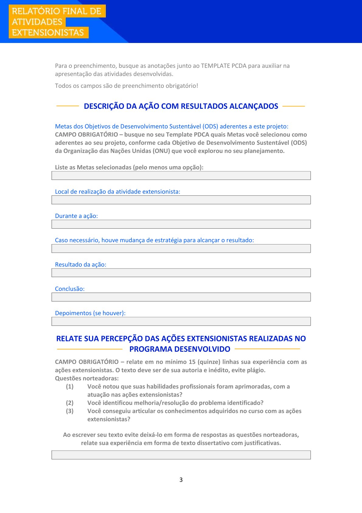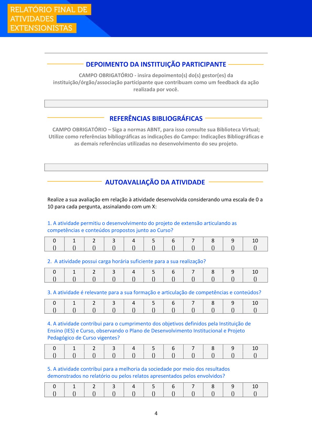 Após a realização das atividades de extensão, o aluno deverá formalizar sua participação enviando este Relatório Final para avaliação no Ambiente Virtual de Aprendizagem (AVA), a fim de comprovar sua atuação.