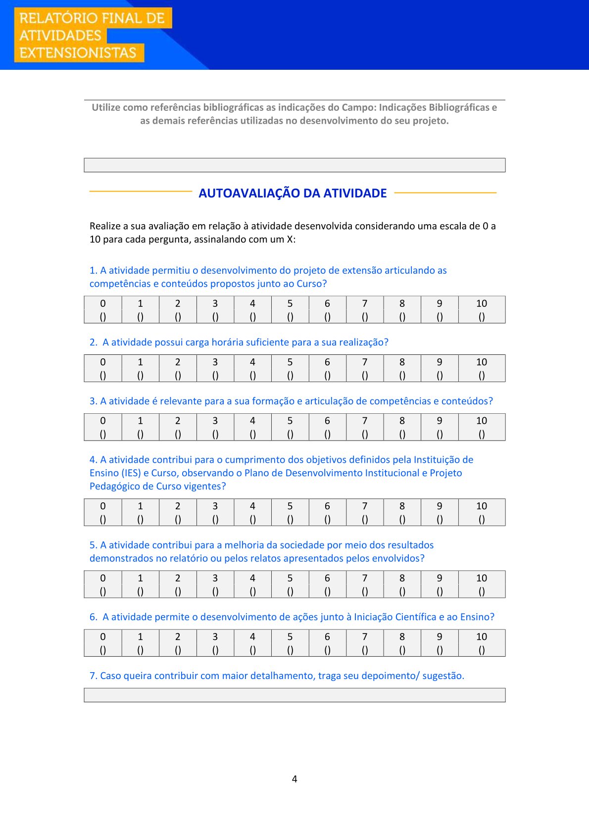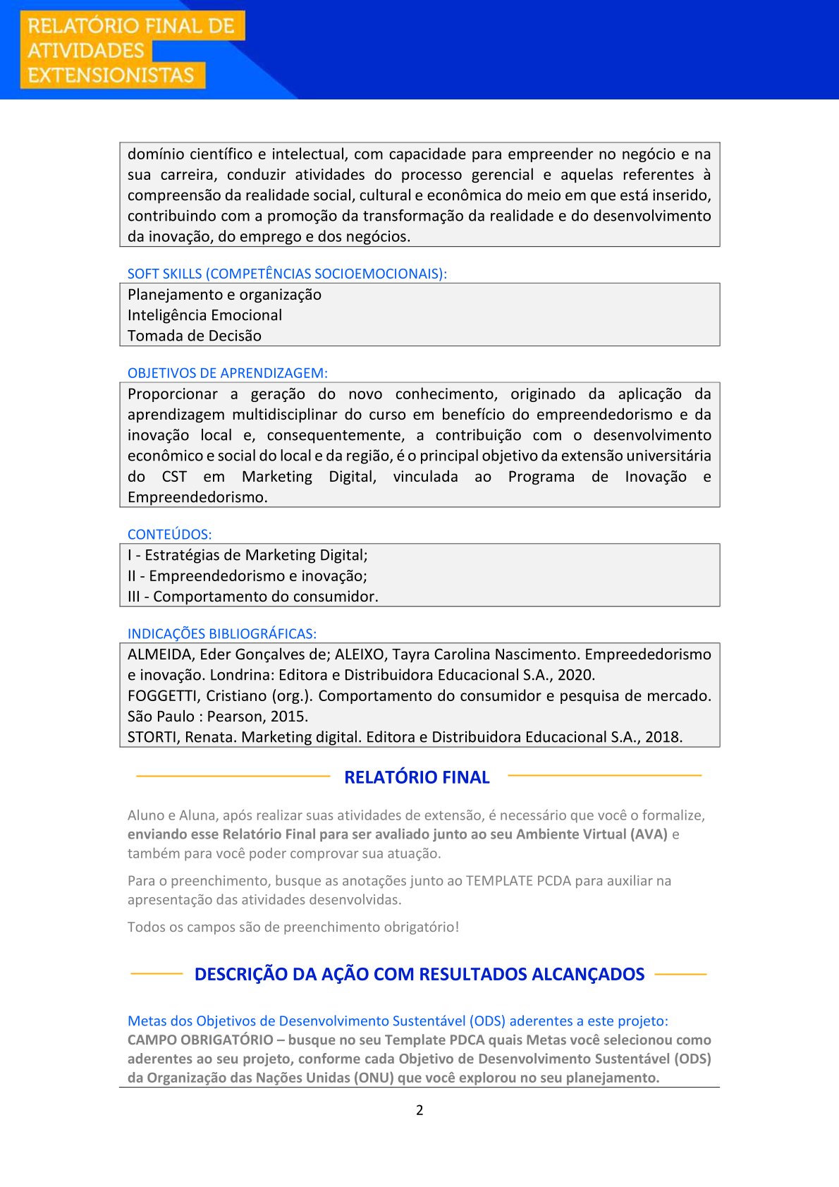 Após a realização das atividades de extensão, o aluno deverá formalizar sua participação enviando este Relatório Final para avaliação no Ambiente Virtual de Aprendizagem (AVA), a fim de comprovar sua atuação.