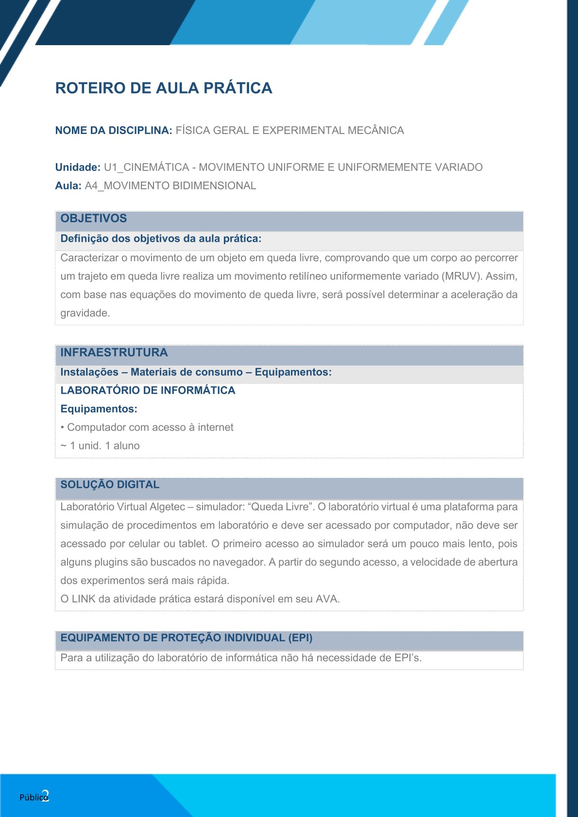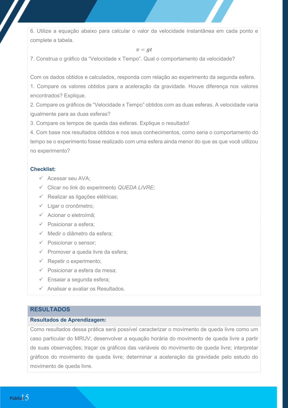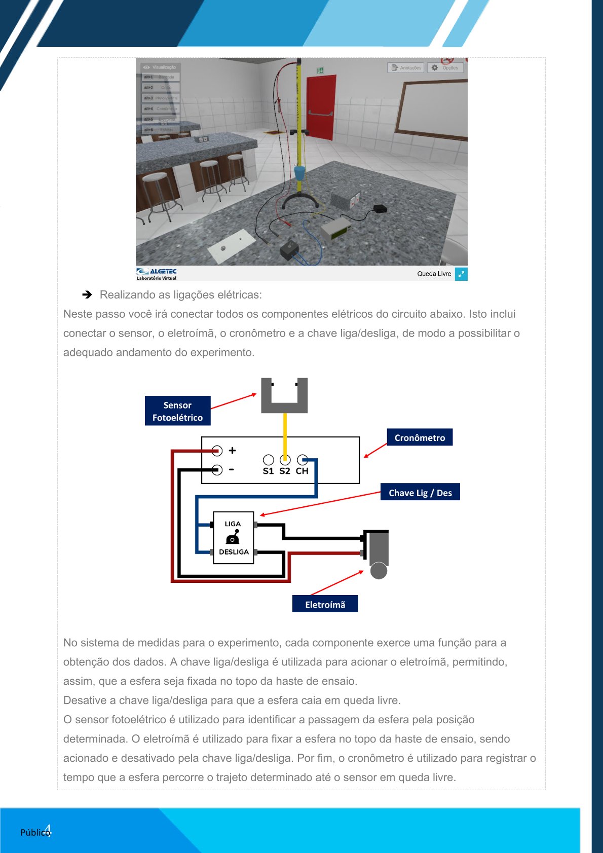 Em seu AVA, você irá encontrar o link do experimento QUEDA LIVRE, que será desenvolvido na plataforma VirtuaLab da Algetec. A partir do acesso, seguem os procedimentos a serem realizados no laboratório virtual para o desenvolvimento da atividade.