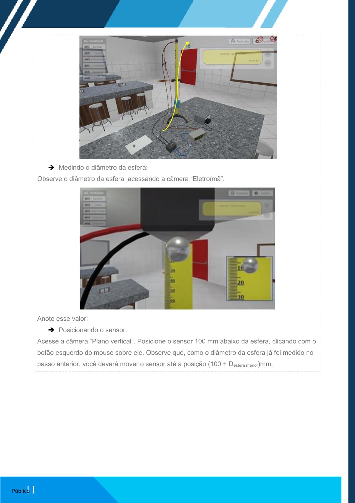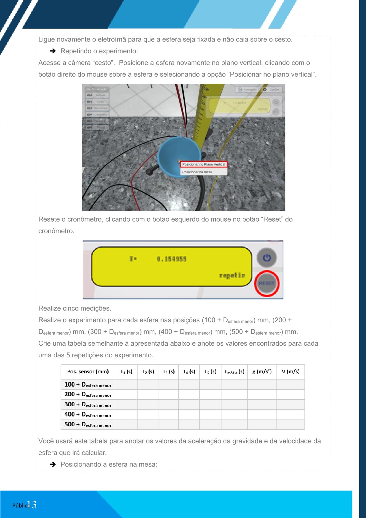 Posicione a esfera na mesa e repita o experimento para a esfera maior, ajustando o sensor para:
