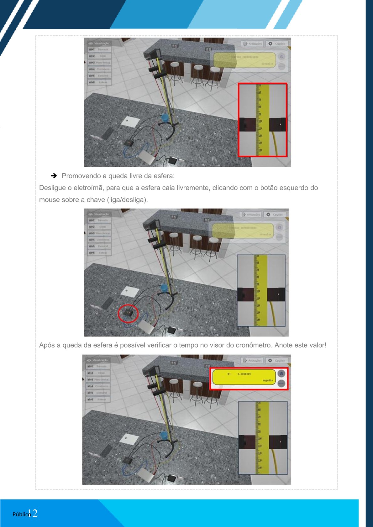 Após a queda, observe o tempo no visor do cronômetro e anote o valor.