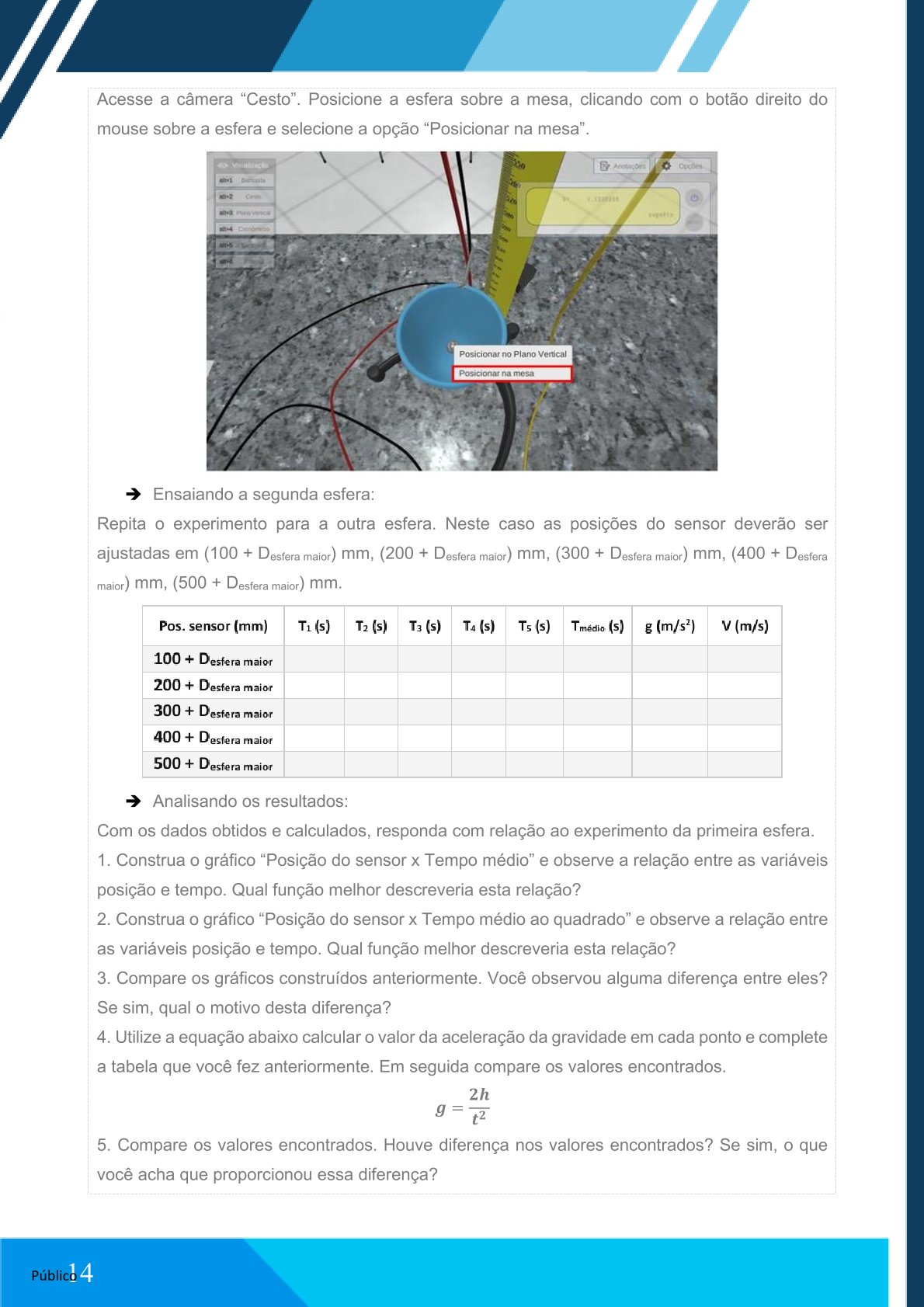 ✓ Promover a queda livre da esfera
