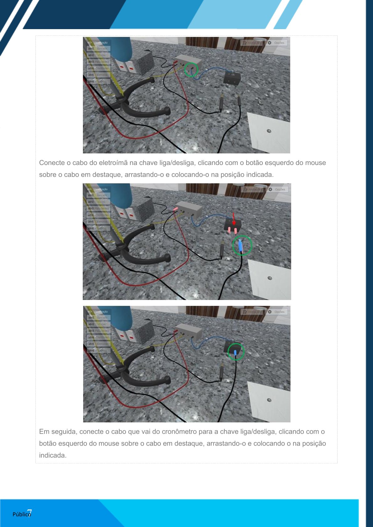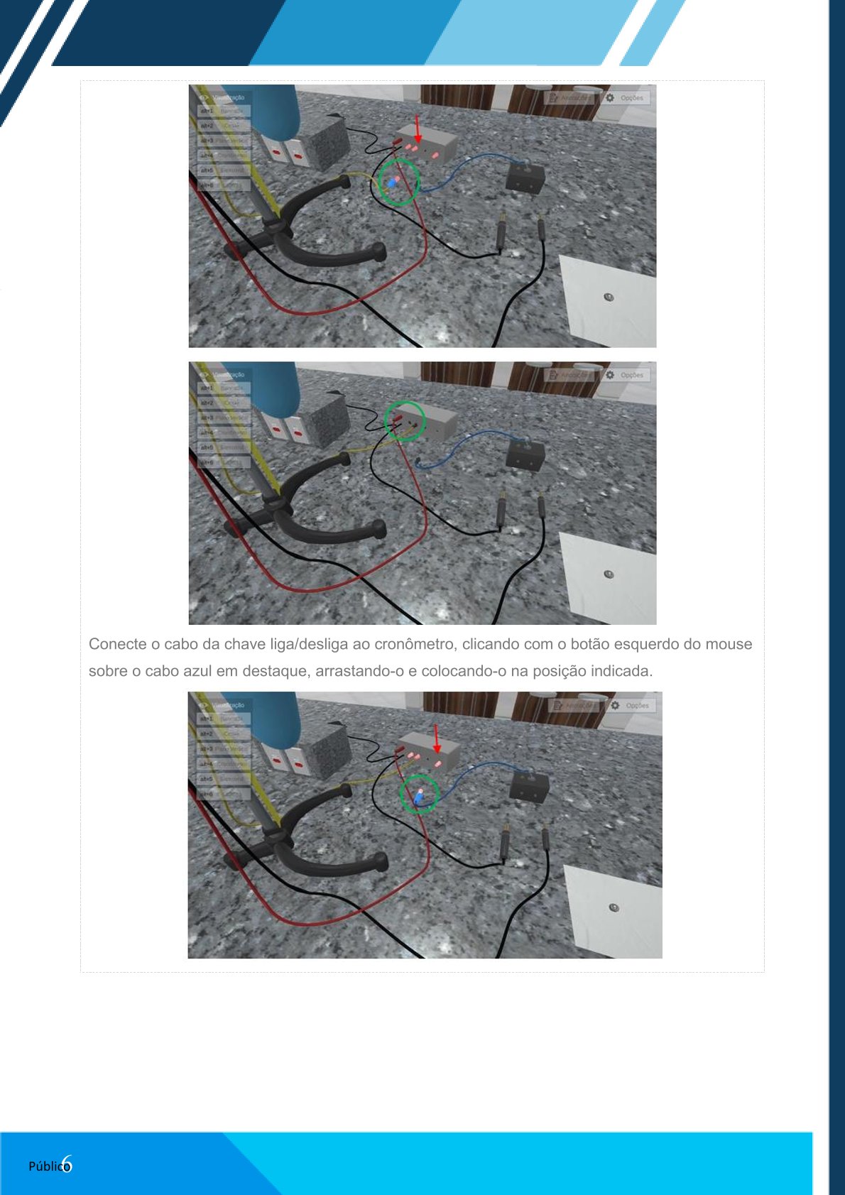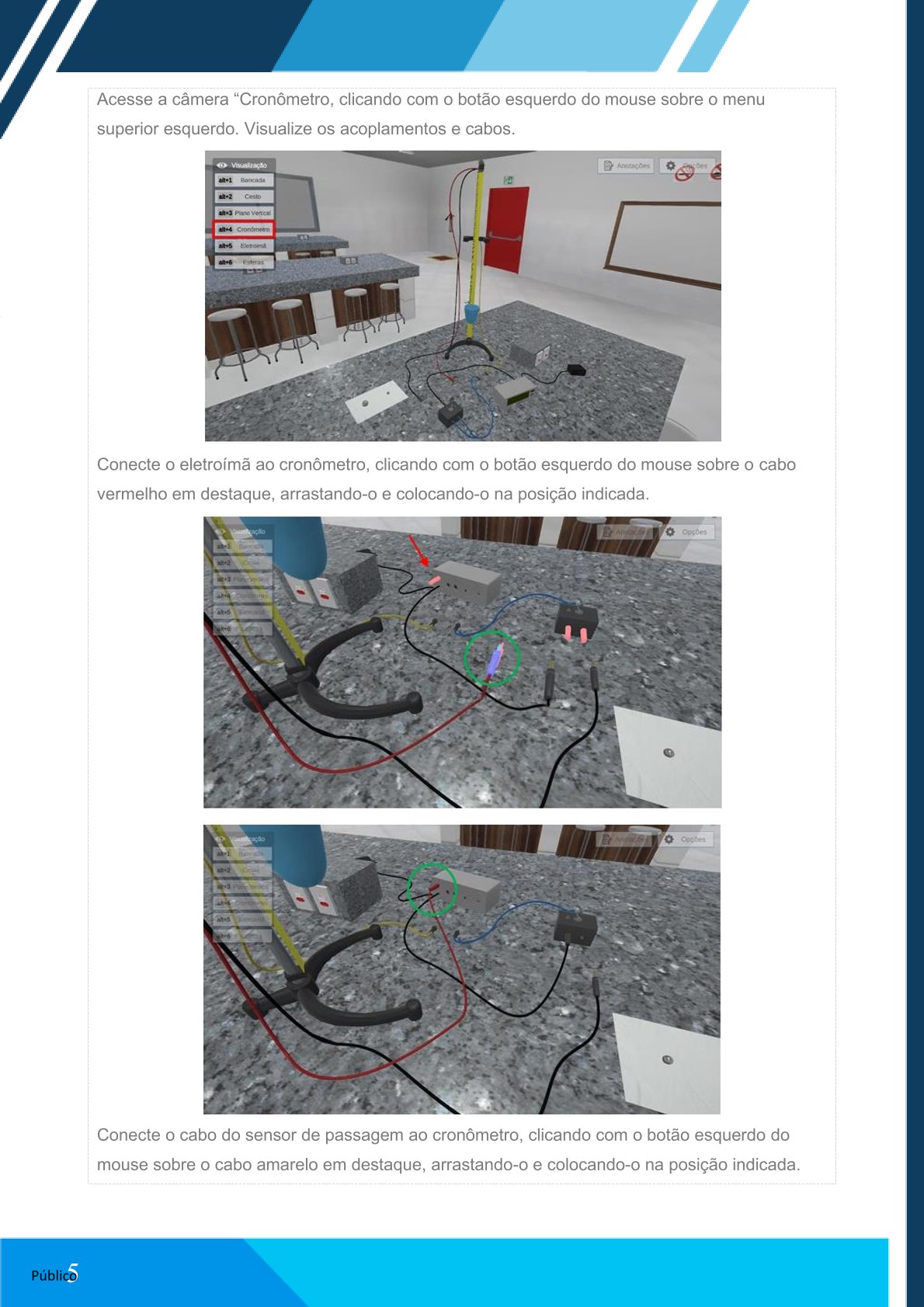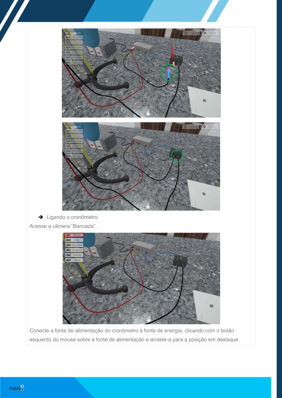 Acesse a câmera “Cronômetro”, clicando com o botão esquerdo do mouse sobre o menu superior esquerdo. Visualize os acoplamentos e cabos.