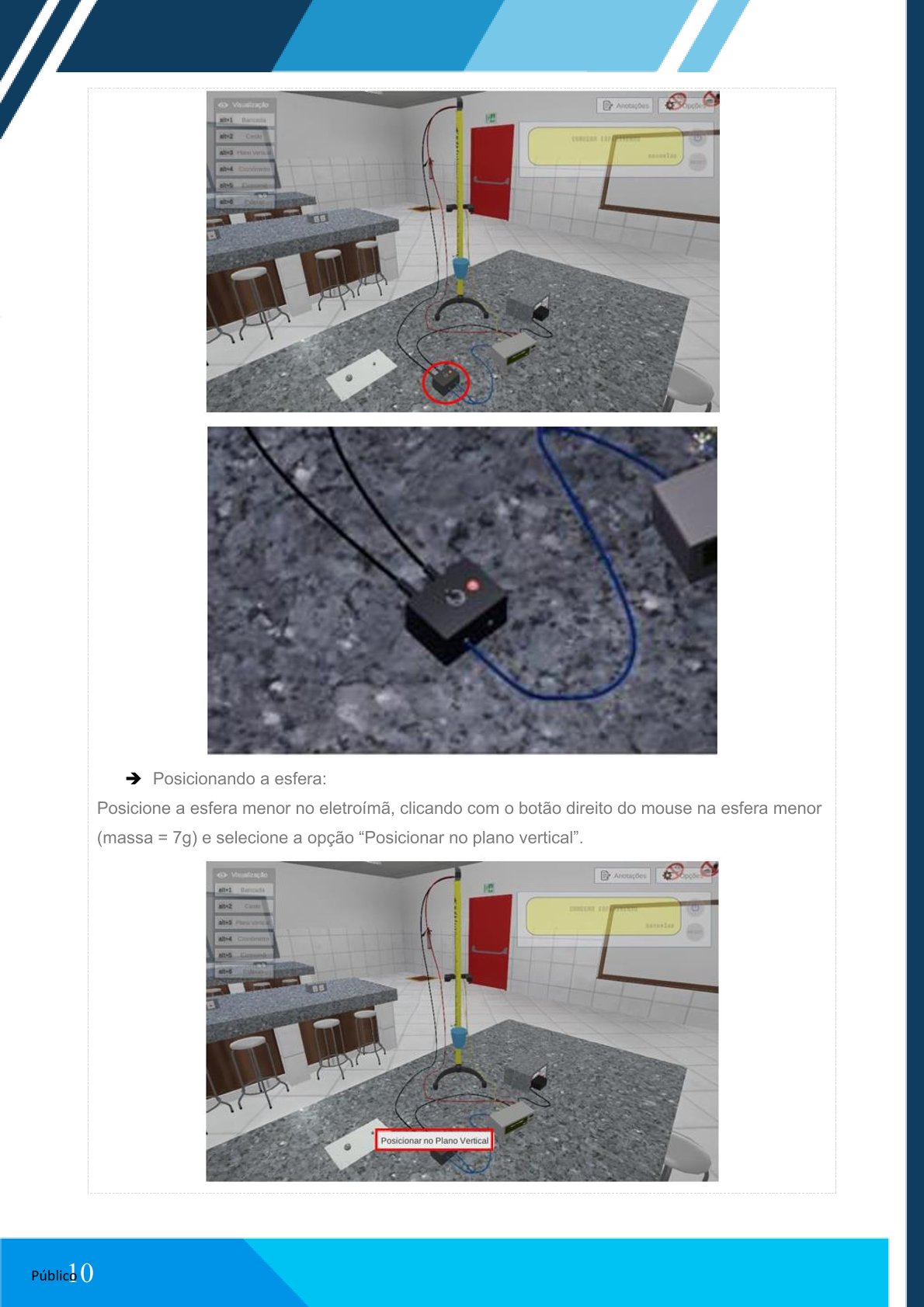 Posicione a esfera menor (massa = 7 g) no eletroímã, clicando com o botão direito do mouse e selecionando “Posicionar no plano vertical”.
