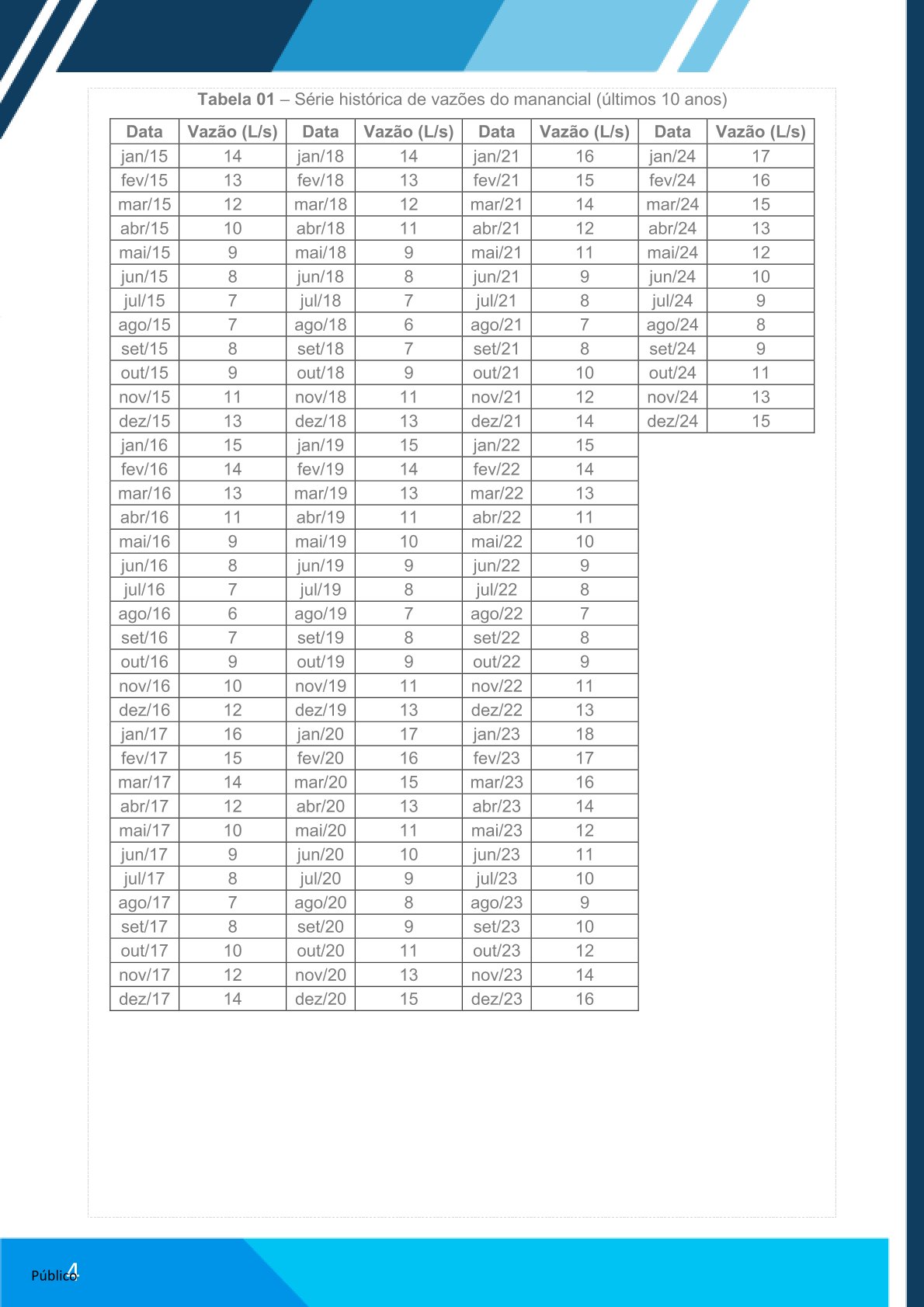 Observar vazões mensais registradas nos últimos 10 anos (Tabela 01)