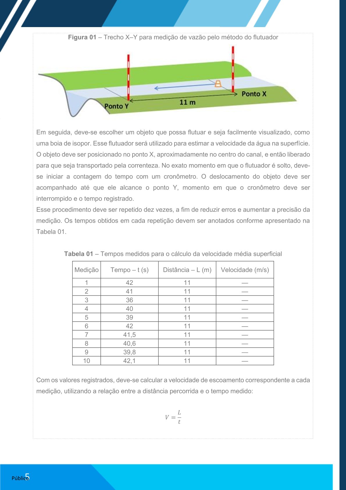 Lançar o flutuador: Registrar o tempo que leva para percorrer o trecho (10 repetições).