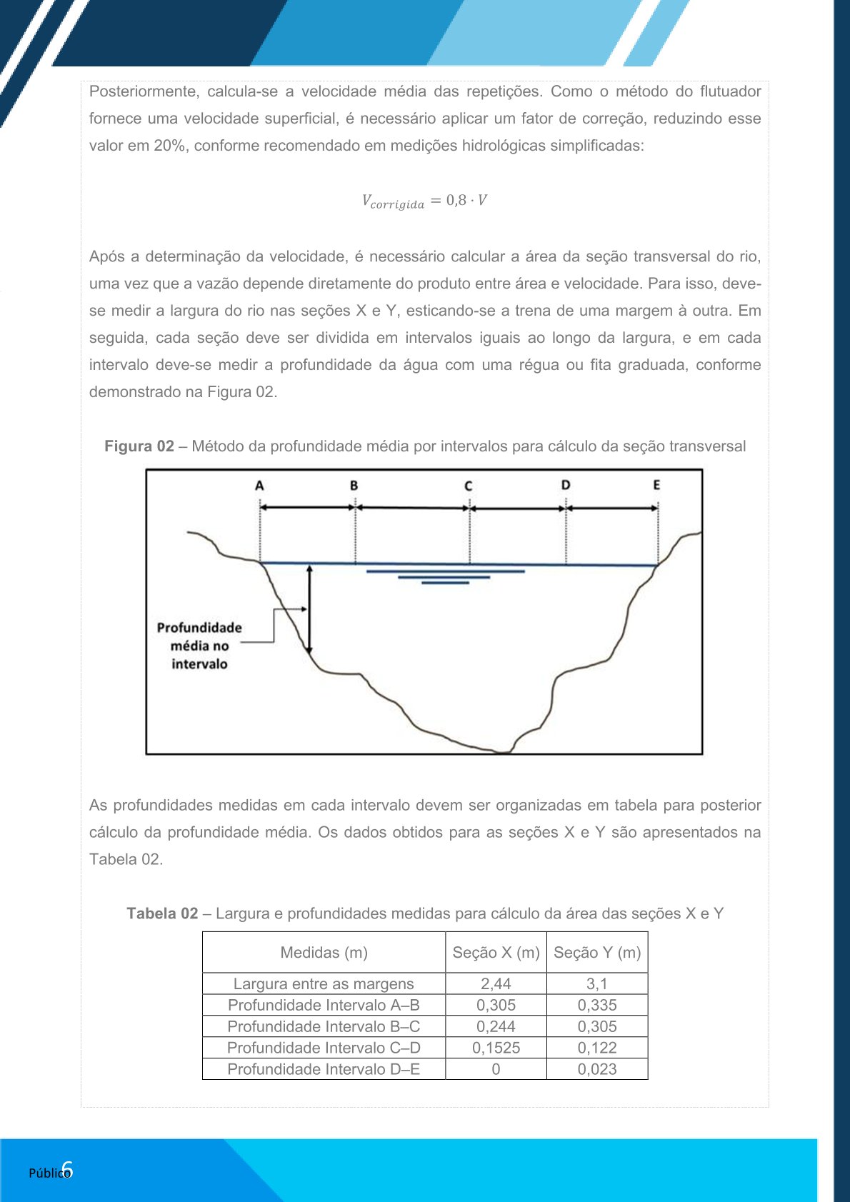 Medir largura e profundidade das seções X e Y: Dividir em intervalos e registrar profundidades.