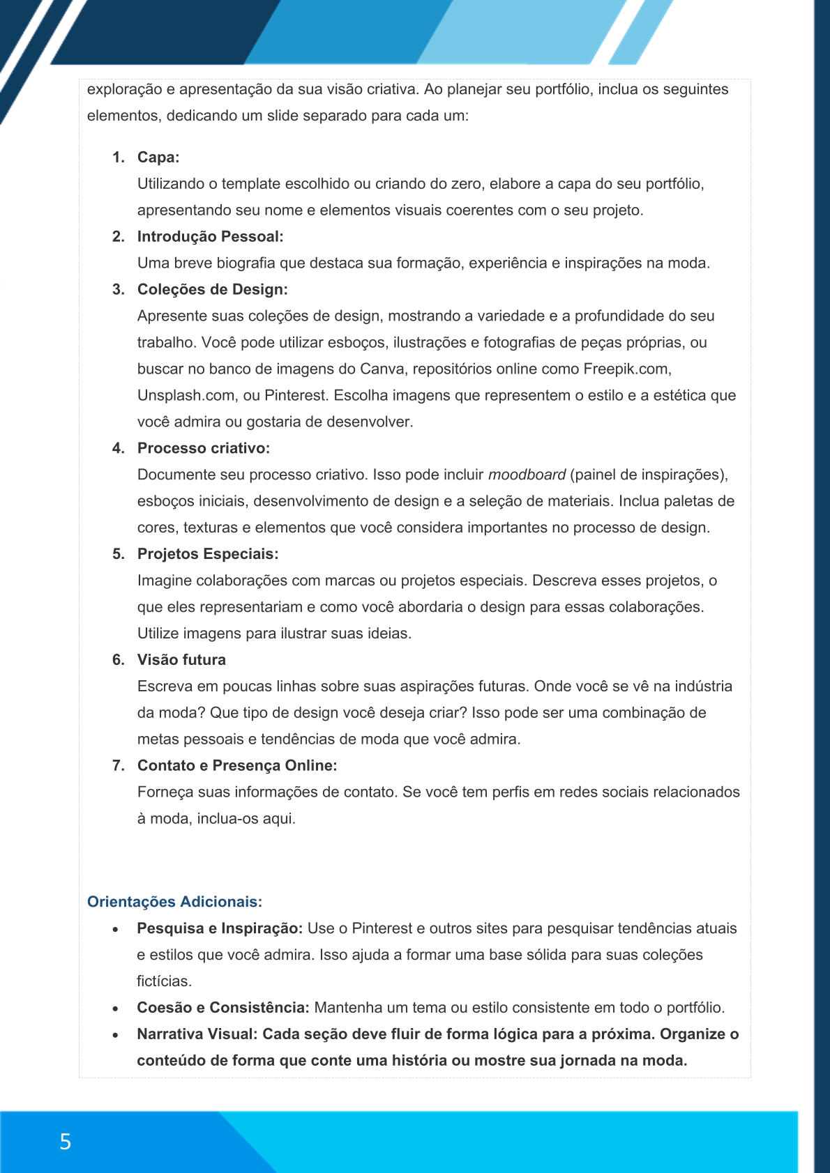 exploração e apresentação da sua visão criativa. Ao planejar seu portfólio, inclua os seguintes