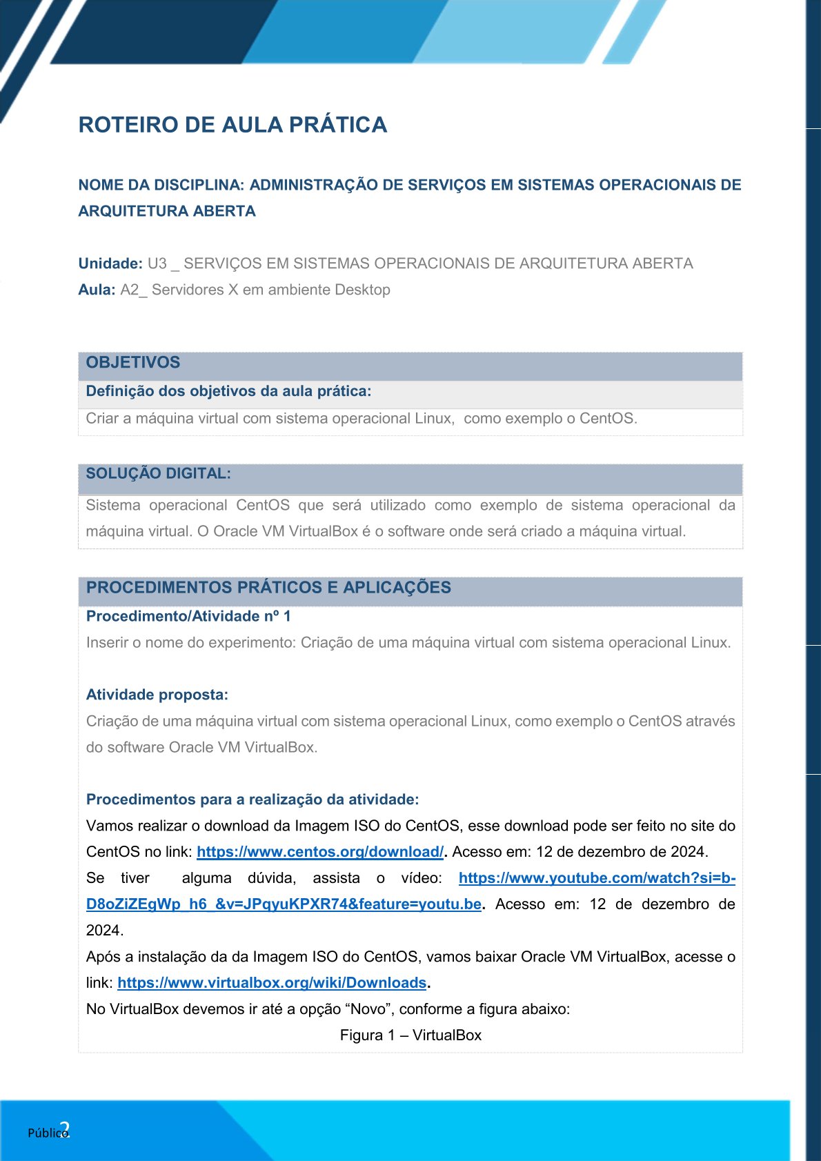 Ao final da prática, o aluno será capaz de criar uma máquina virtual com sistema operacional Linux (CentOS) utilizando o Oracle VM VirtualBox.