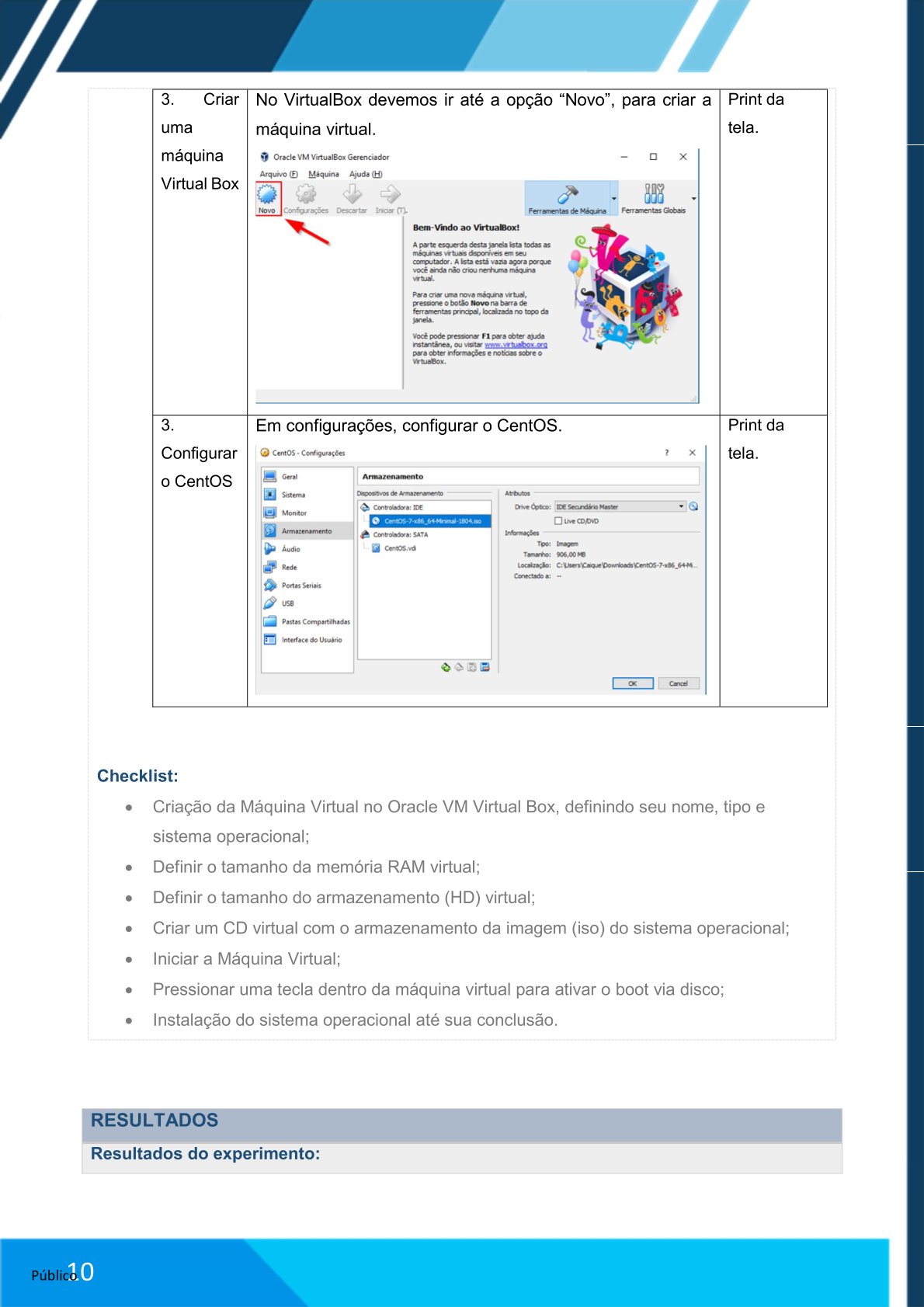 | 4. Configurar CentOS | Configurar nome, tipo, memória e armazenamento | Print da tela |