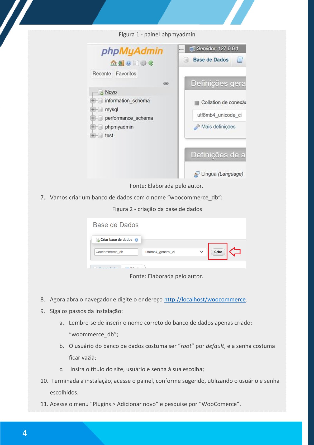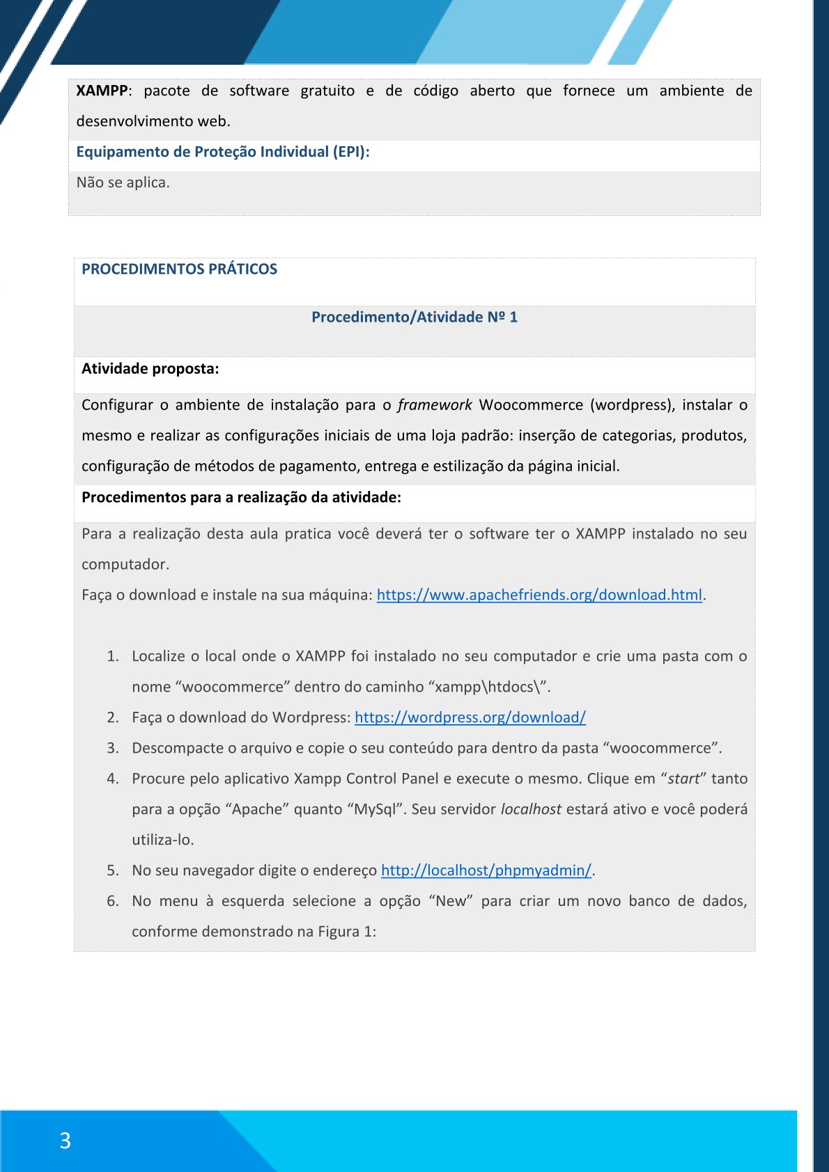 Configurar o ambiente de instalação para o framework WooCommerce (WordPress), instalar o mesmo e realizar as configurações iniciais de uma loja padrão: inserção de categorias, produtos, configuração de métodos de pagamento, entrega e estilização da página inicial.