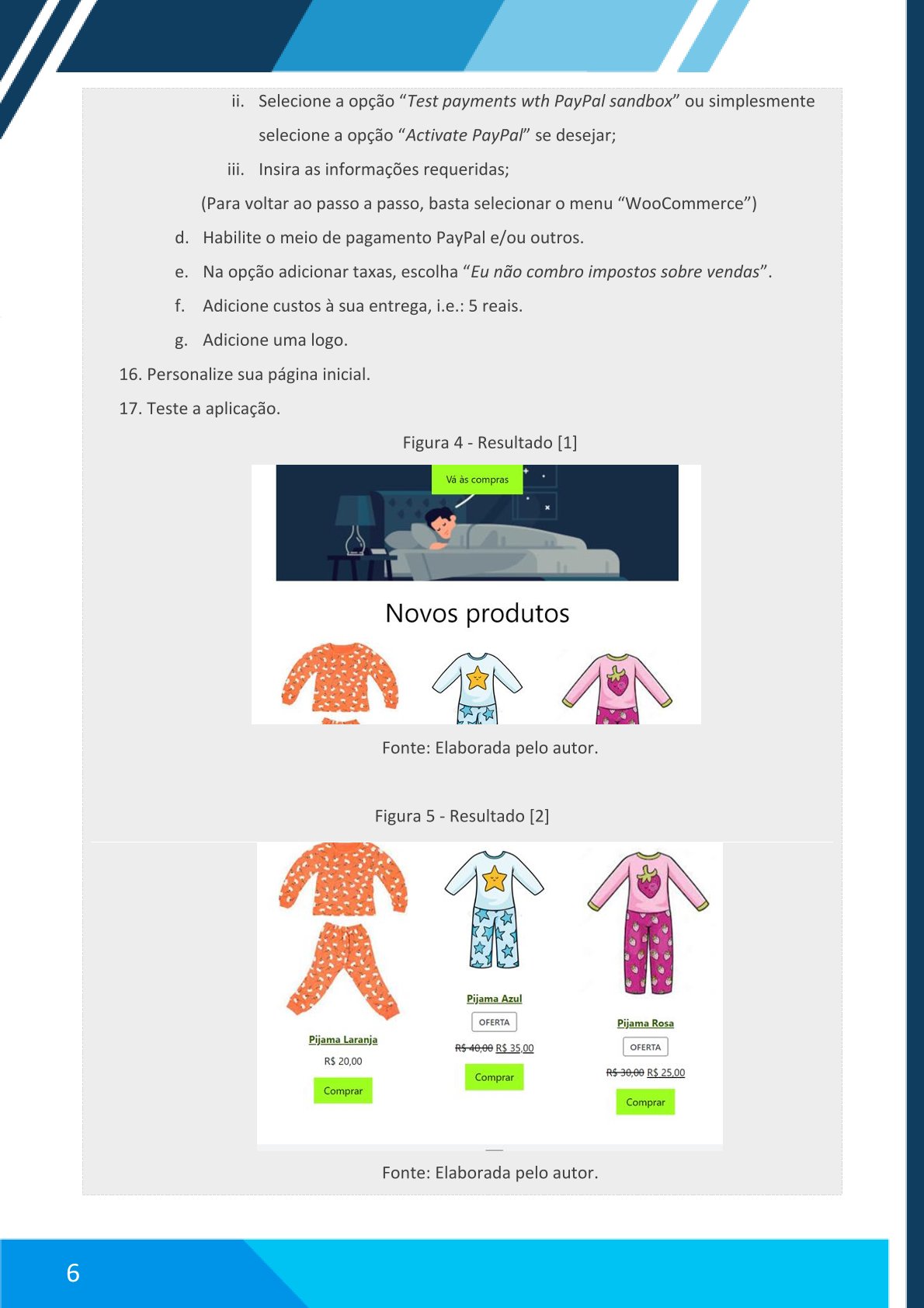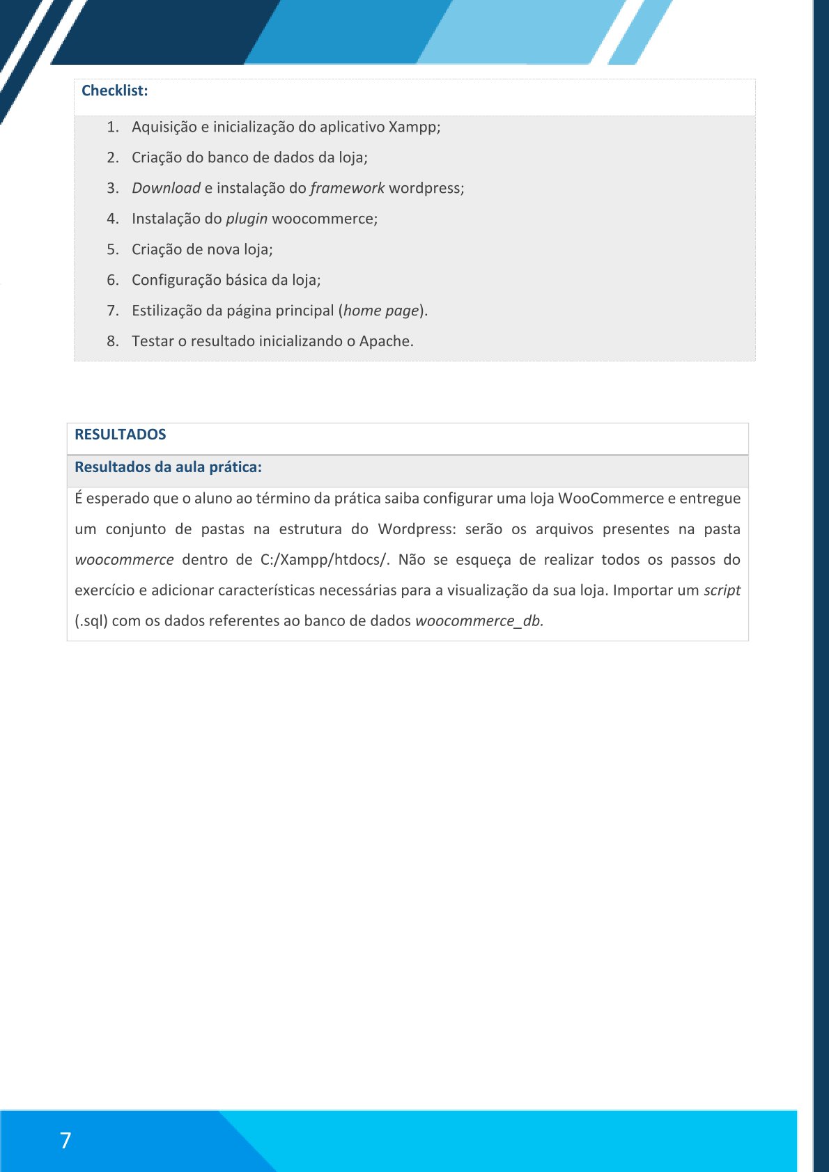 É esperado que o aluno, ao término da prática, saiba configurar uma loja virtual utilizando o WooCommerce e entregue um conjunto de arquivos organizados na estrutura do WordPress. Esses arquivos devem estar presentes na pasta woocommerce, localizada em:C:/Xampp/htdocs/woocommerce