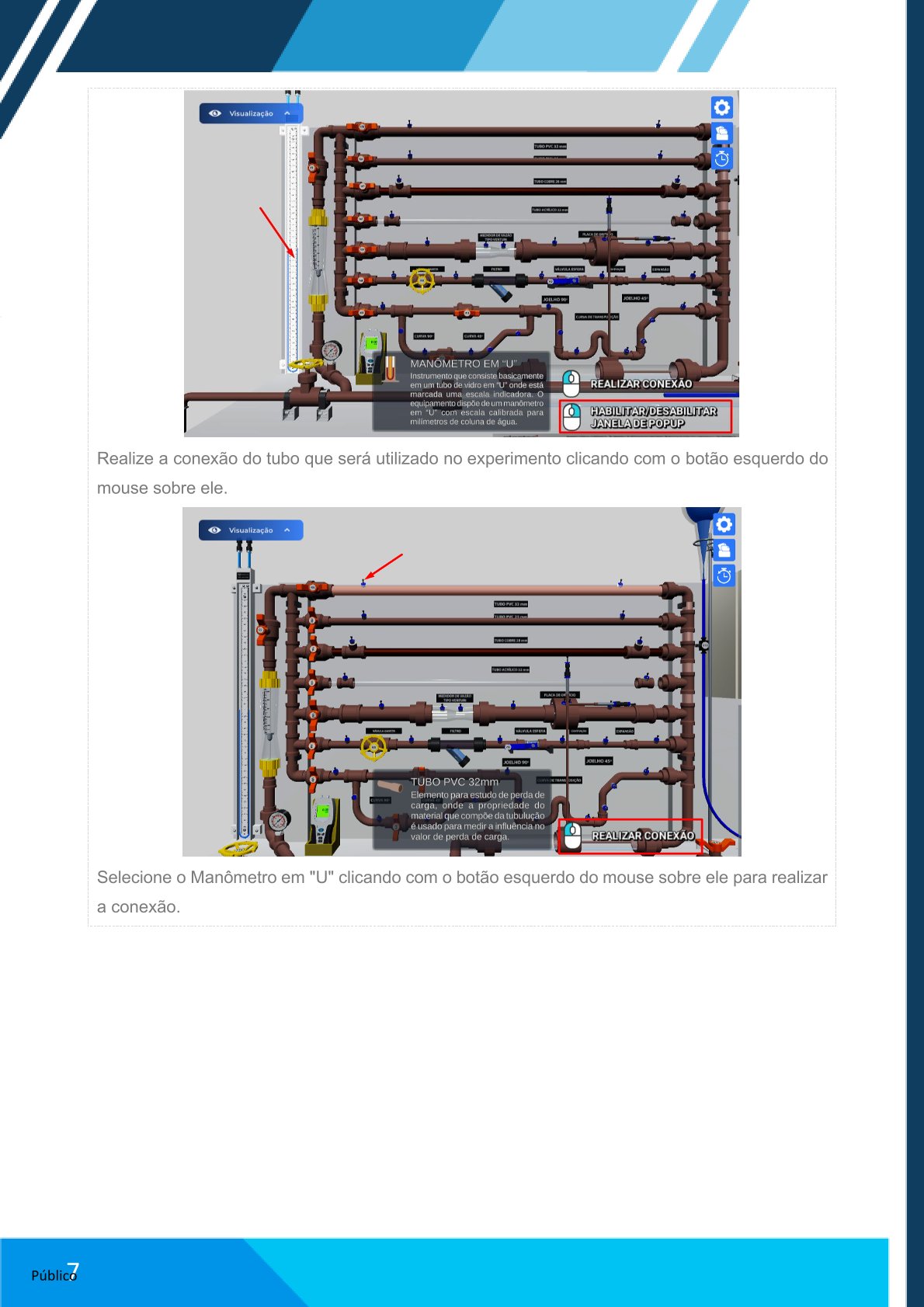 Como forma de melhor compreender esses conceitos, a atividade prática será realizada em uma versão virtual da bancada didática de mecânica dos fluidos e bombas. Para isso, é necessário o uso da bomba centrífuga, válvulas, mangueira, funil de separação, pipeta, cronômetro e tubulações de PVC.