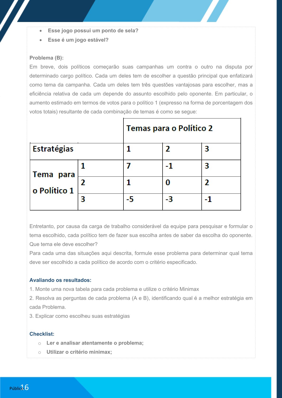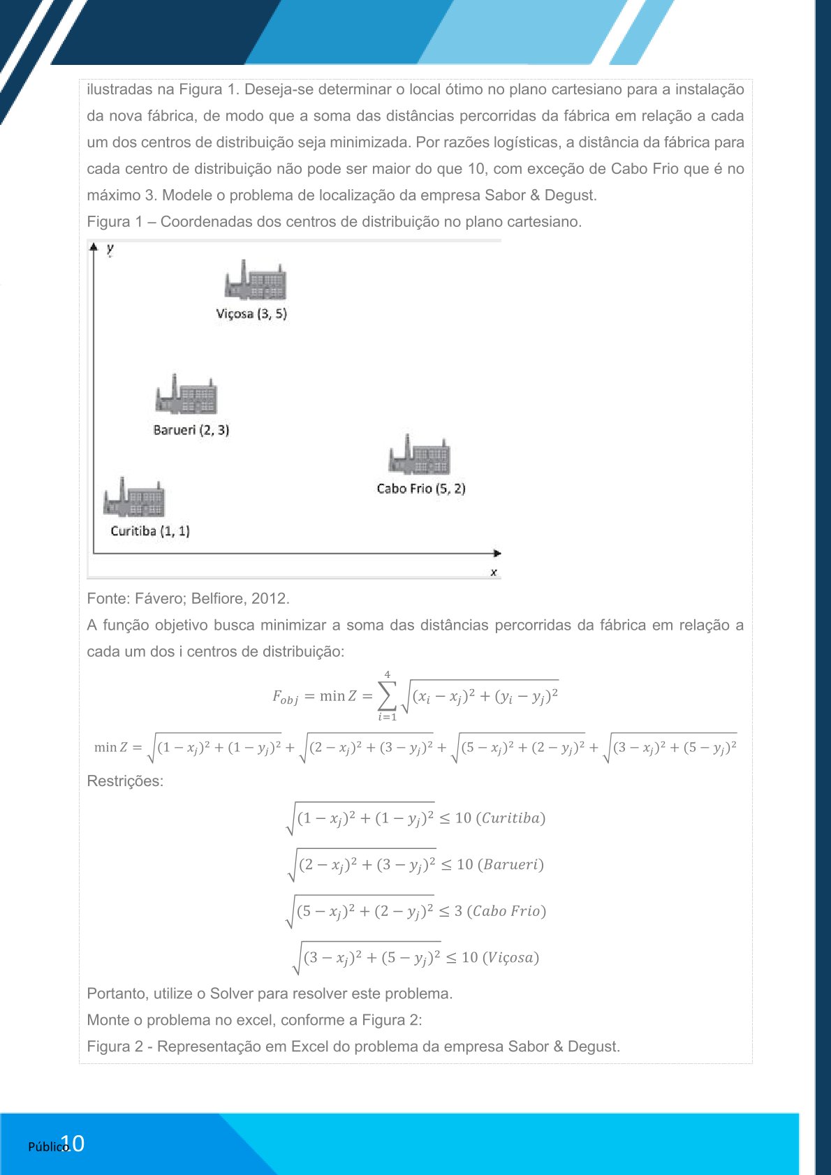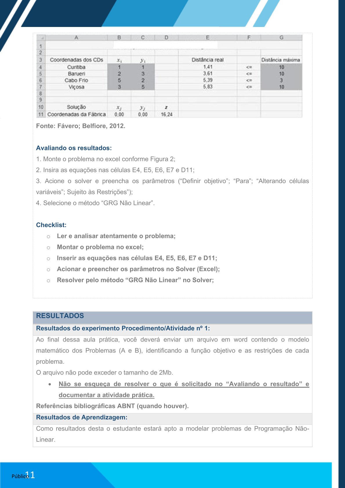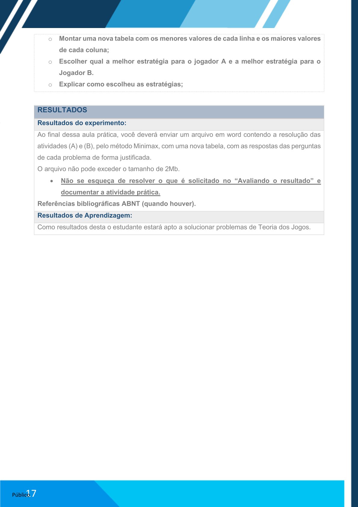 Ao final dessa aula prática, você deverá enviar um arquivo em word contendo as informações obtidas na atividade, em que deve conter a resolução do problema, mostrando o problema subdividido em estágios e as tabelas de decisão de cada estágio, além de indicar quais “nós” contemplam o caminho mais curto.