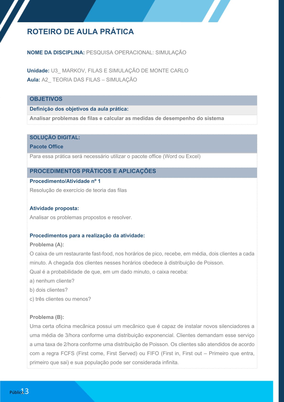 ROTEIRO DE AULA PRÁTICA – PESQUISA OPERACIONAL – SIMULAÇÃO