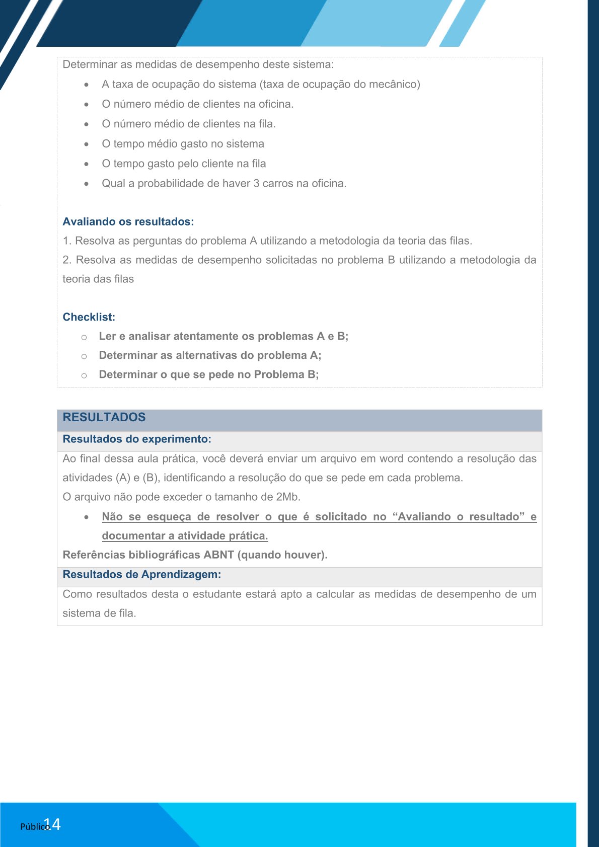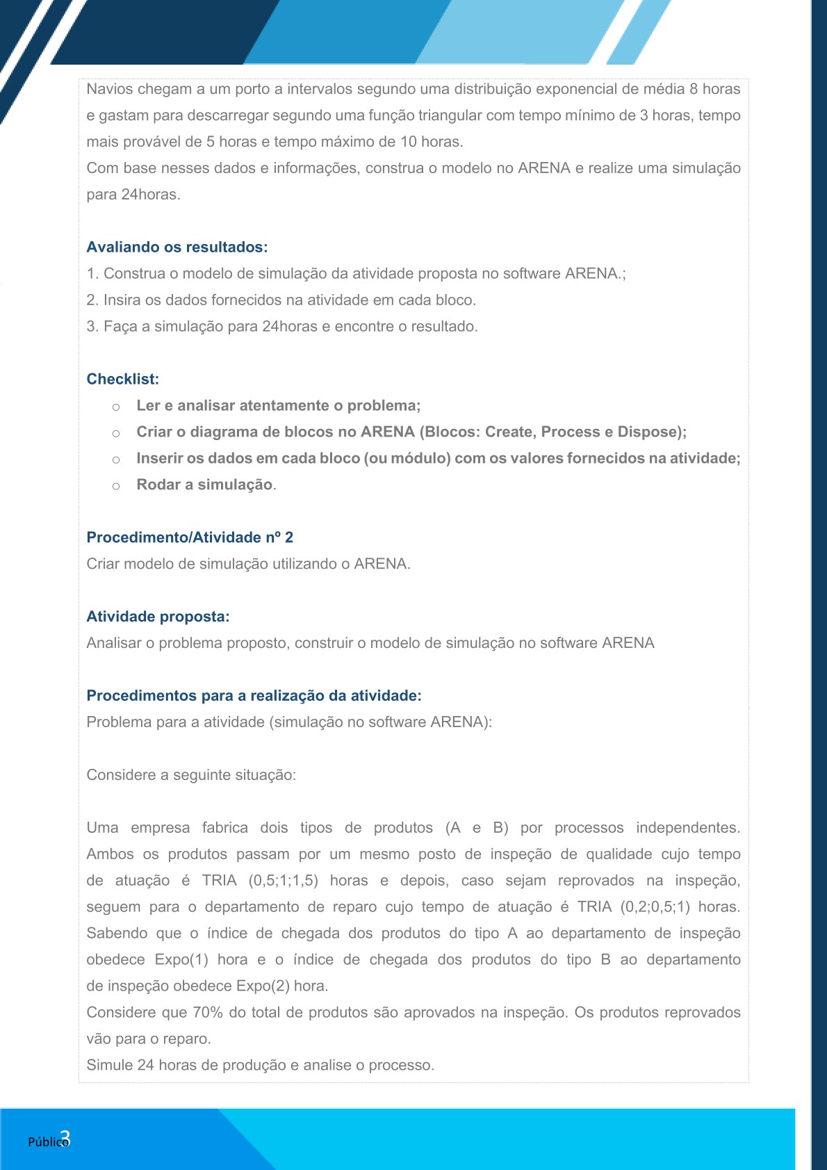 Ao final dessa aula prática, você deverá enviar um arquivo em word contendo as informações obtidas nos experimentos, envie prints: do modelo construído no ARENA; dos dados inseridos em cada módulo (ou bloco); do modelo ao final da simulação de 24horas (com os valores que ficou em cada bloco) das duas atividades (A e B)