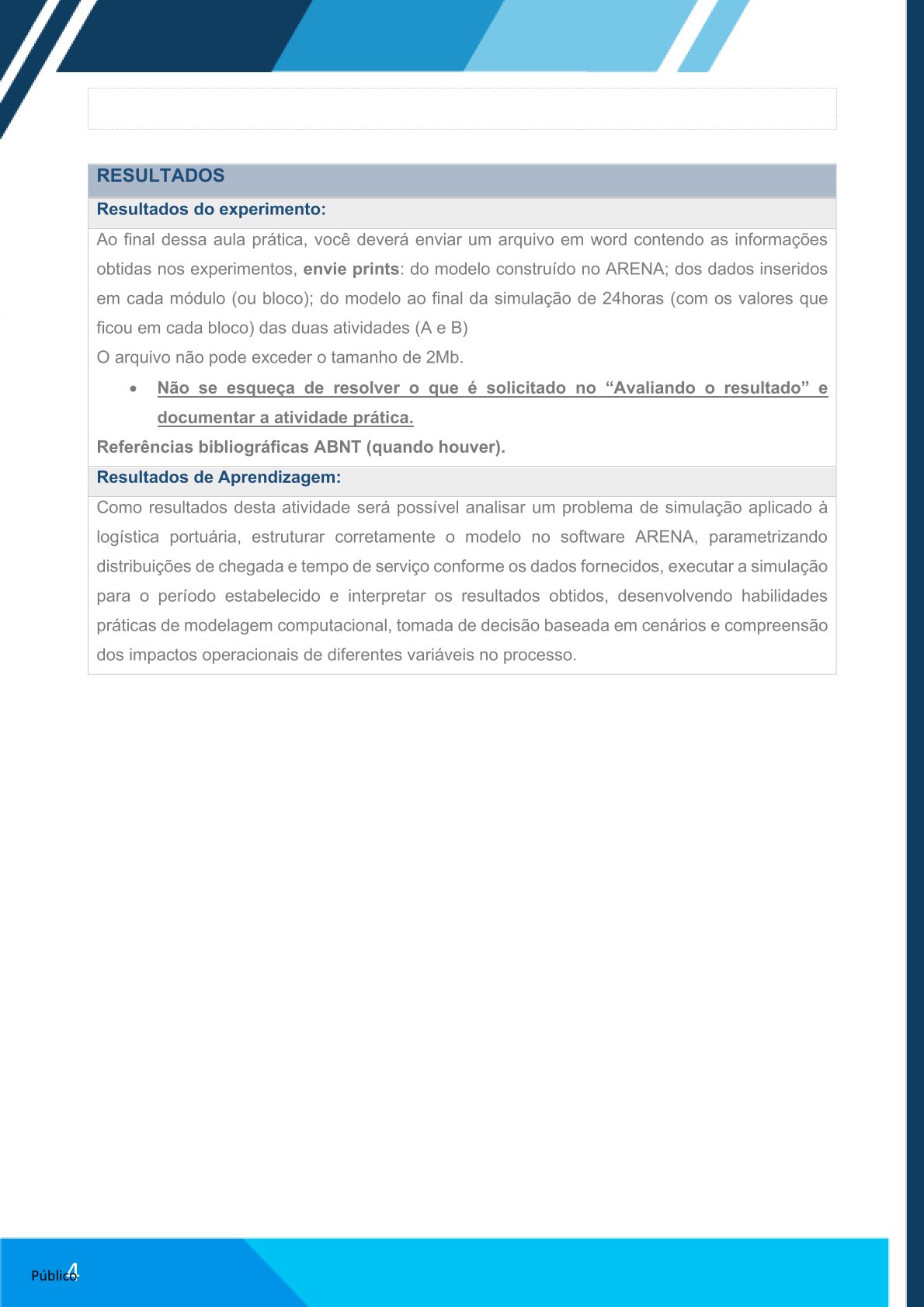 Como resultados desta atividade será possível analisar um problema de simulação aplicado à logística portuária, estruturar corretamente o modelo no software ARENA, parametrizando distribuições de chegada e tempo de serviço conforme os dados fornecidos, executar a simulação para o período estabelecido e interpretar os resultados obtidos, desenvolvendo habilidades práticas de modelagem computacional, tomada de decisão baseada em cenários e compreensão dos impactos operacionais de diferentes variáveis no processo.