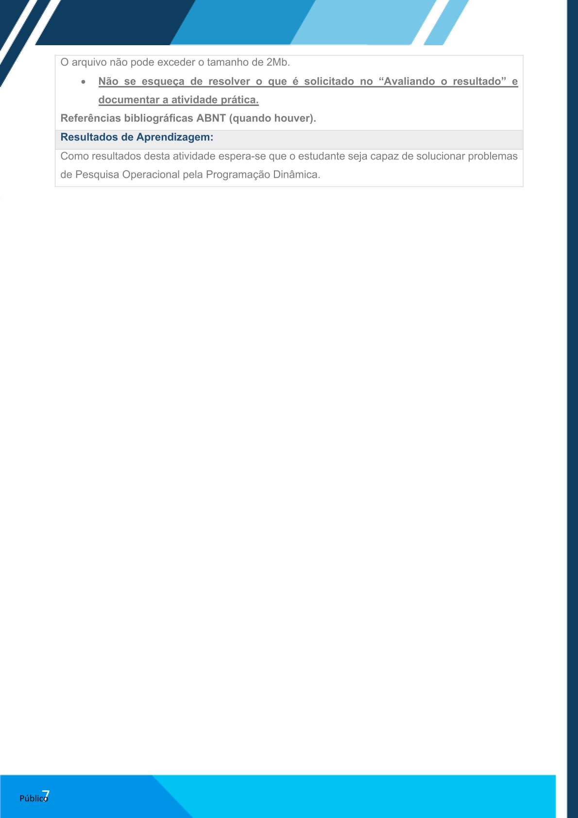 Como resultados desta atividade espera-se que o estudante seja capaz de solucionar problemas de Pesquisa Operacional pela Programação Dinâmica.