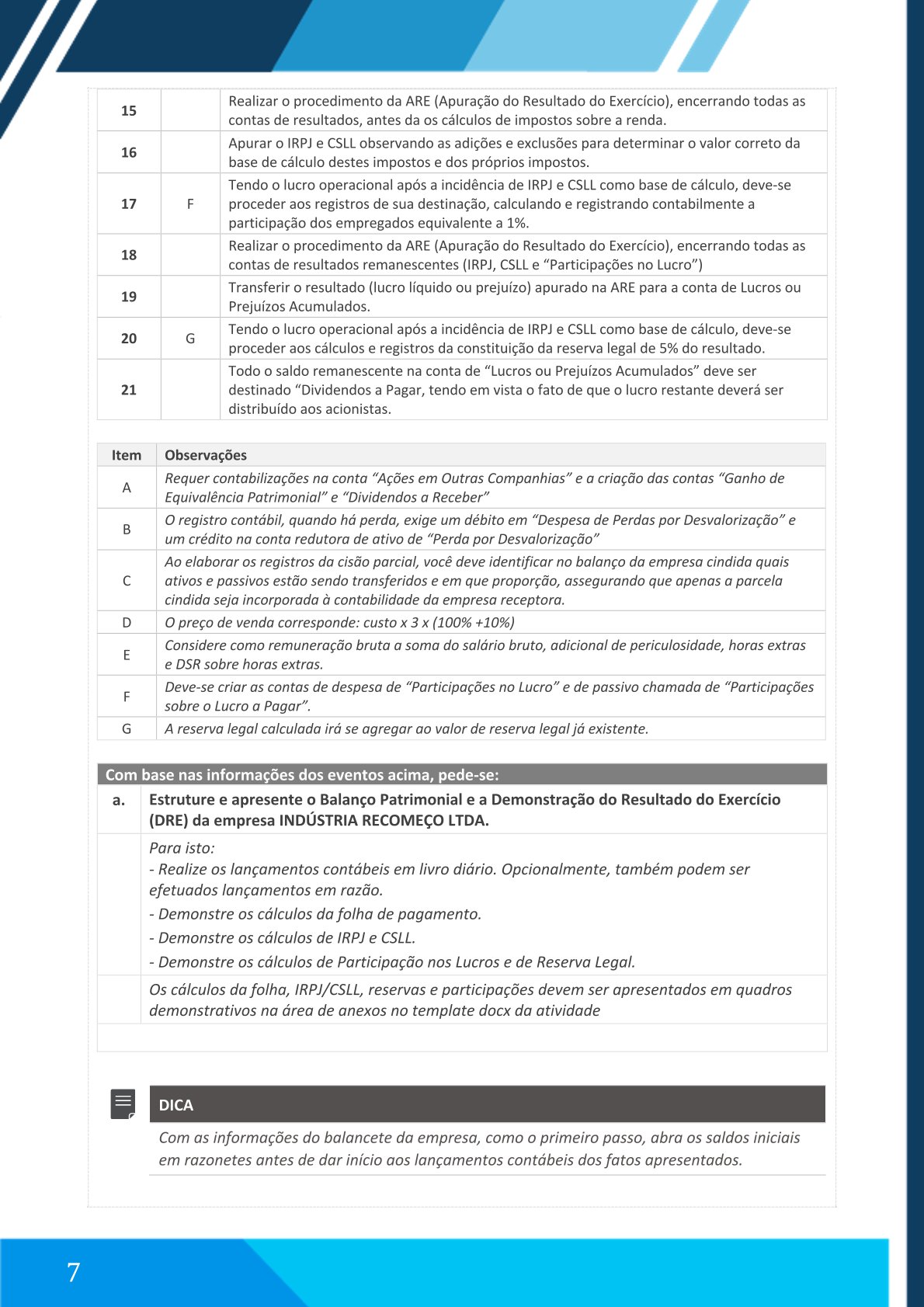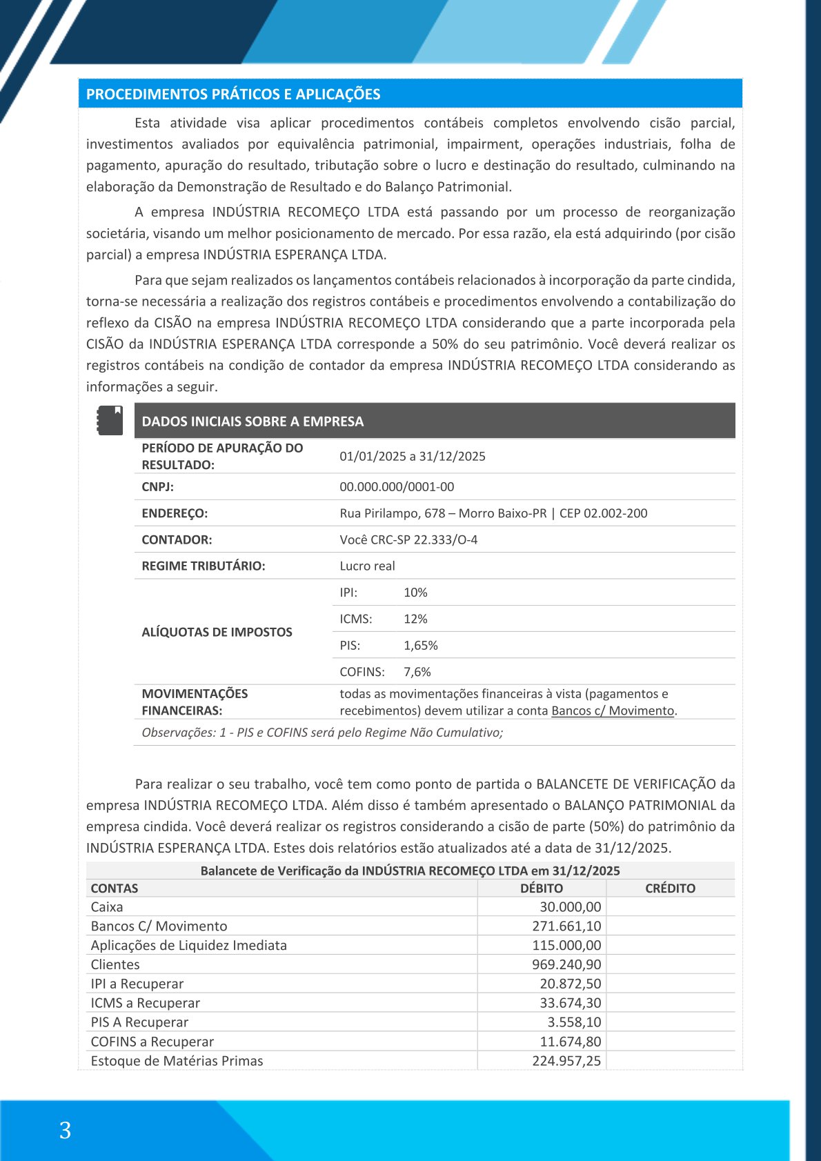 Compreender e aplicar os principais procedimentos contábeis relacionados à reorganização societária por cisão parcial, através da análise prática do caso envolvendo:Indústria Recomeço Ltda.