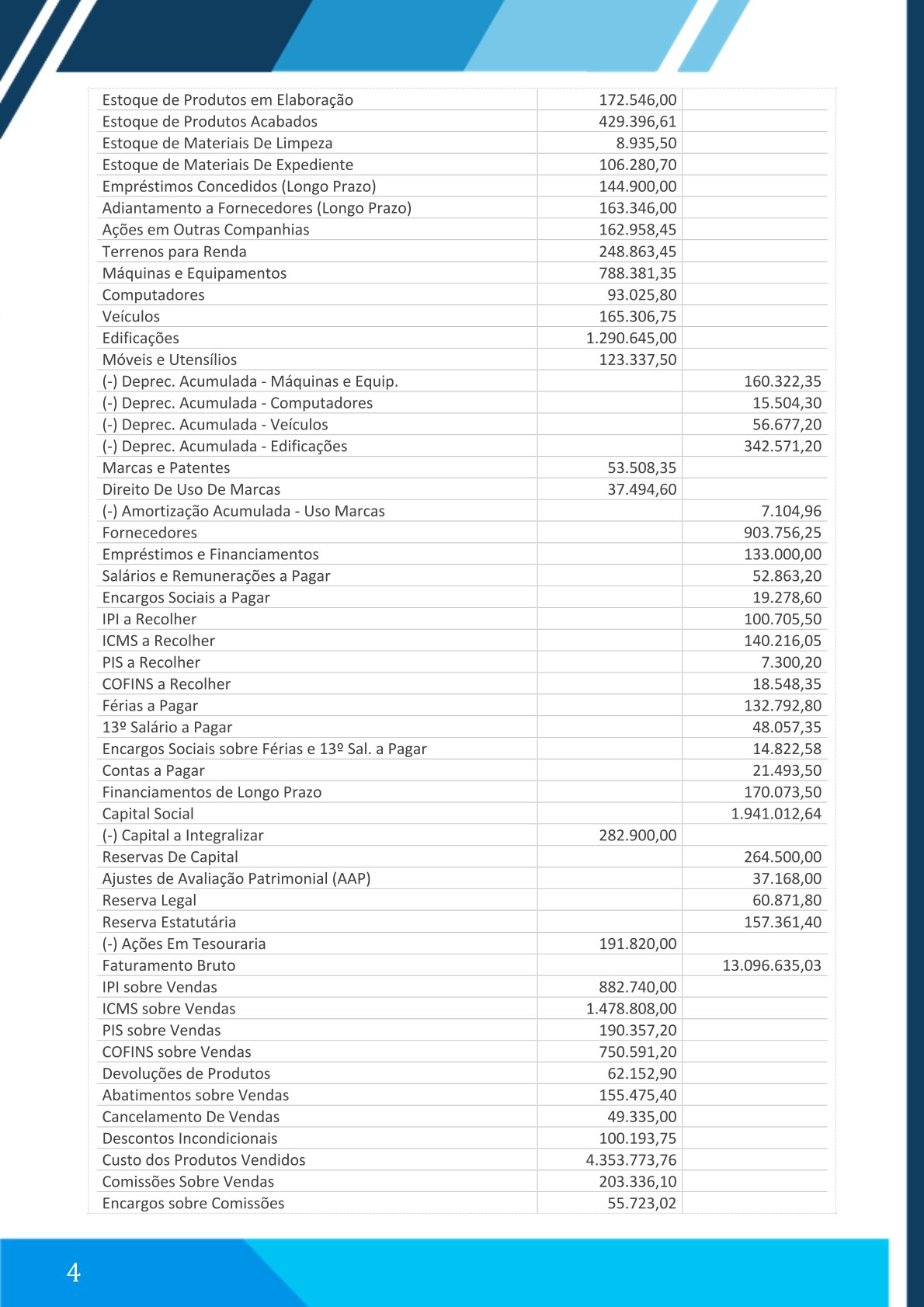 (Listagem de contas com saldos de débito e crédito – conforme enviado no documento original)