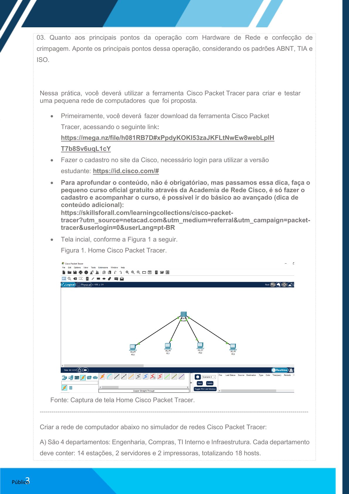 O Cisco Packet Tracer é um programa educacional gratuito que permite simular uma rede de computadores, através de equipamentos e configurações presentes em situações reais. O programa apresenta uma interface gráfica simples, com suportes multimídia que auxiliam na confecção das simulações.