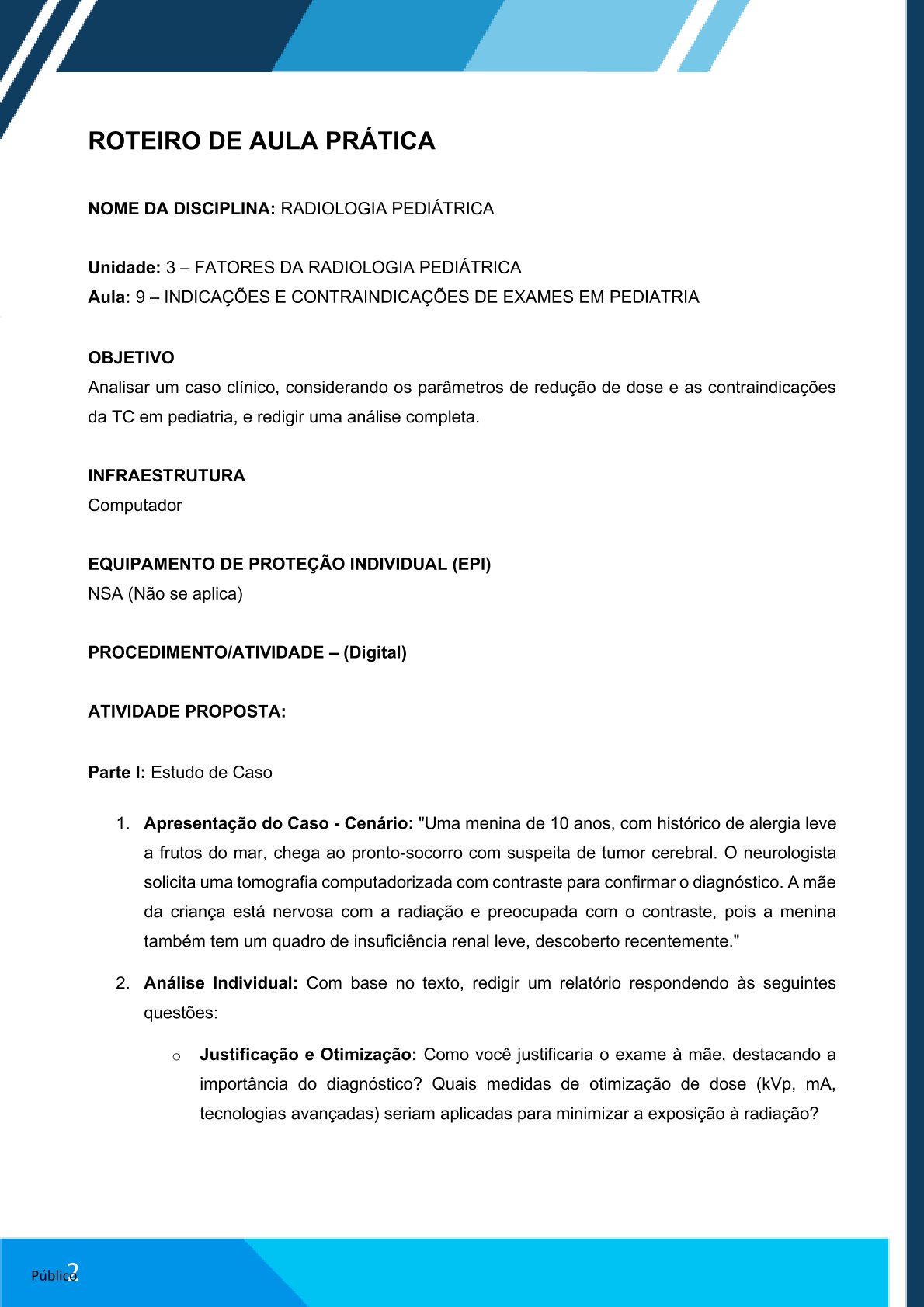 Analisar um caso clínico, considerando os parâmetros de redução de dose e as contraindicações da TC em pediatria, e redigir uma análise completa.