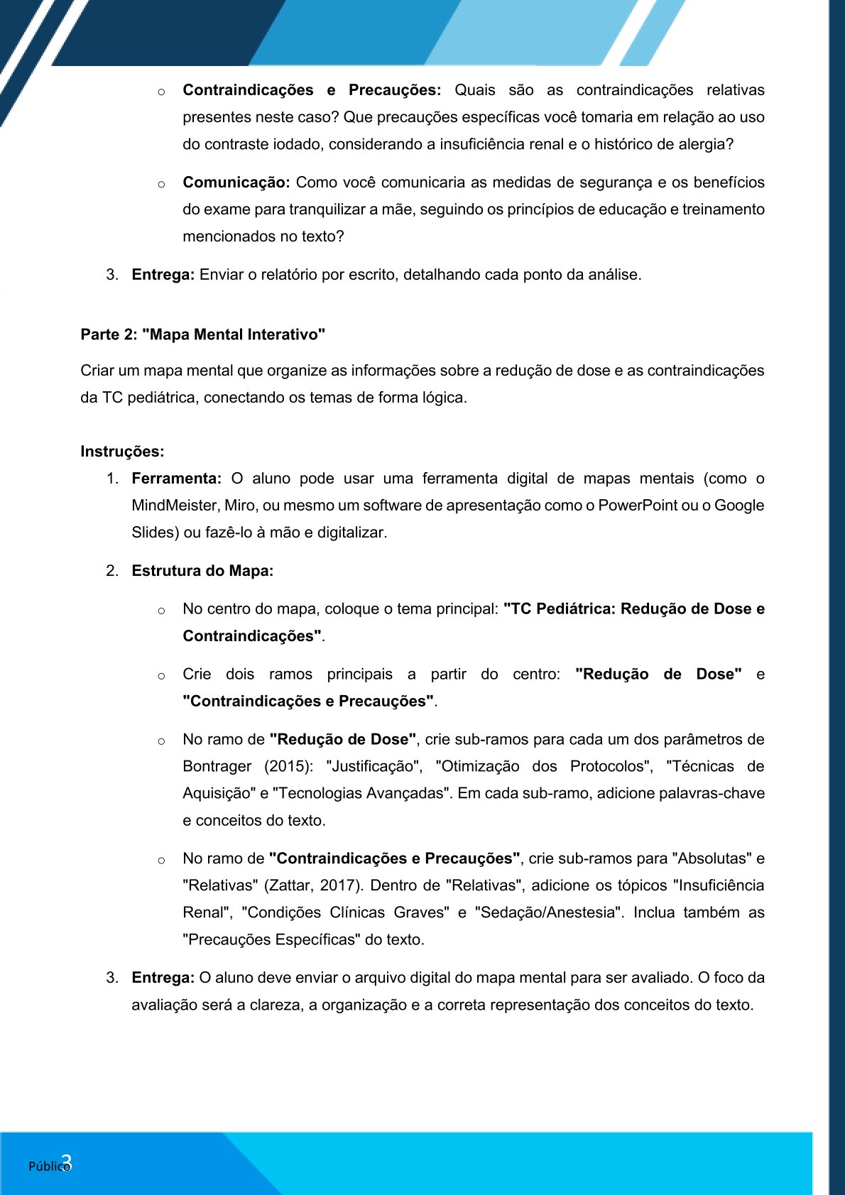 Criar um mapa mental que organize as informações sobre a redução de dose e as contraindicações da TC pediátrica, conectando os temas de forma lógica.