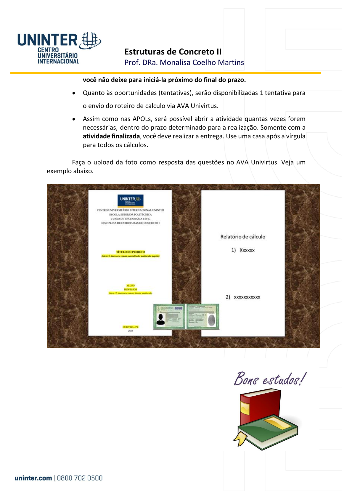 - Ao finalizar o relatório de cálculo, o aluno deverá tirar uma foto juntamente com um documento pessoal (RG, CNH ou outro que permita a conferência de autenticidade).